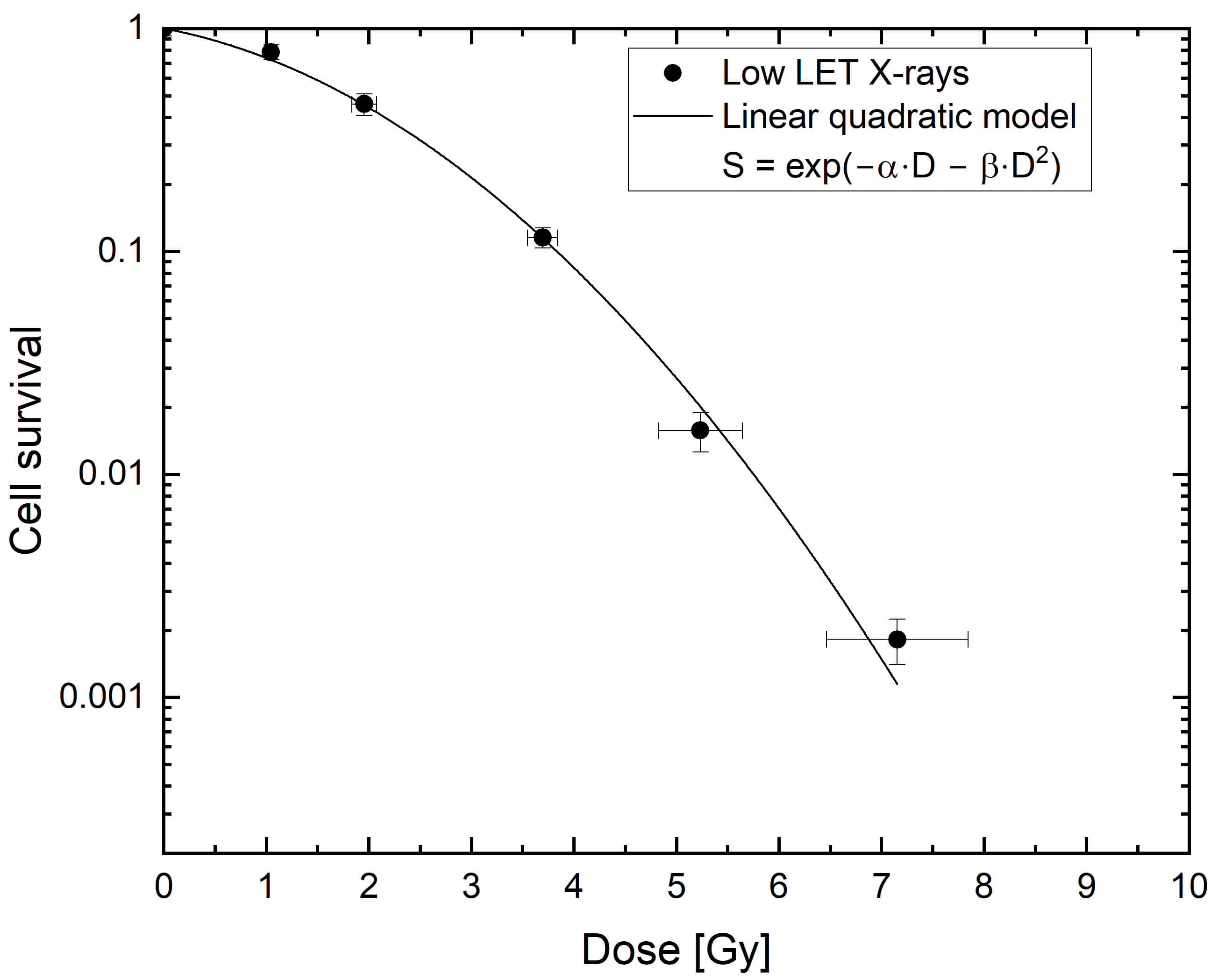 The uncertainties of the SF values were calculated by Gaussian error propagation, and finally, the survival curves were fitted by the linear-quadratic (LQ) model:
