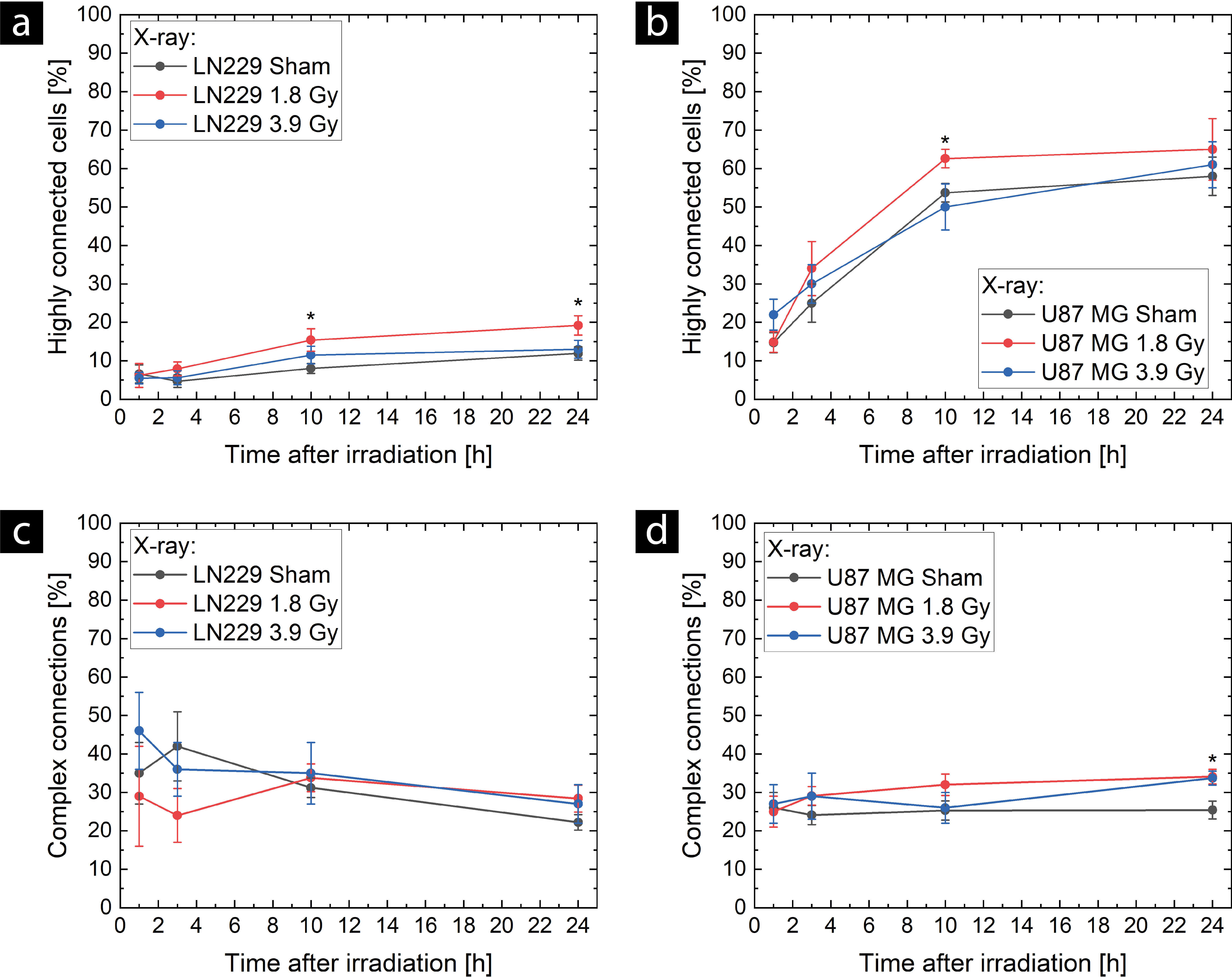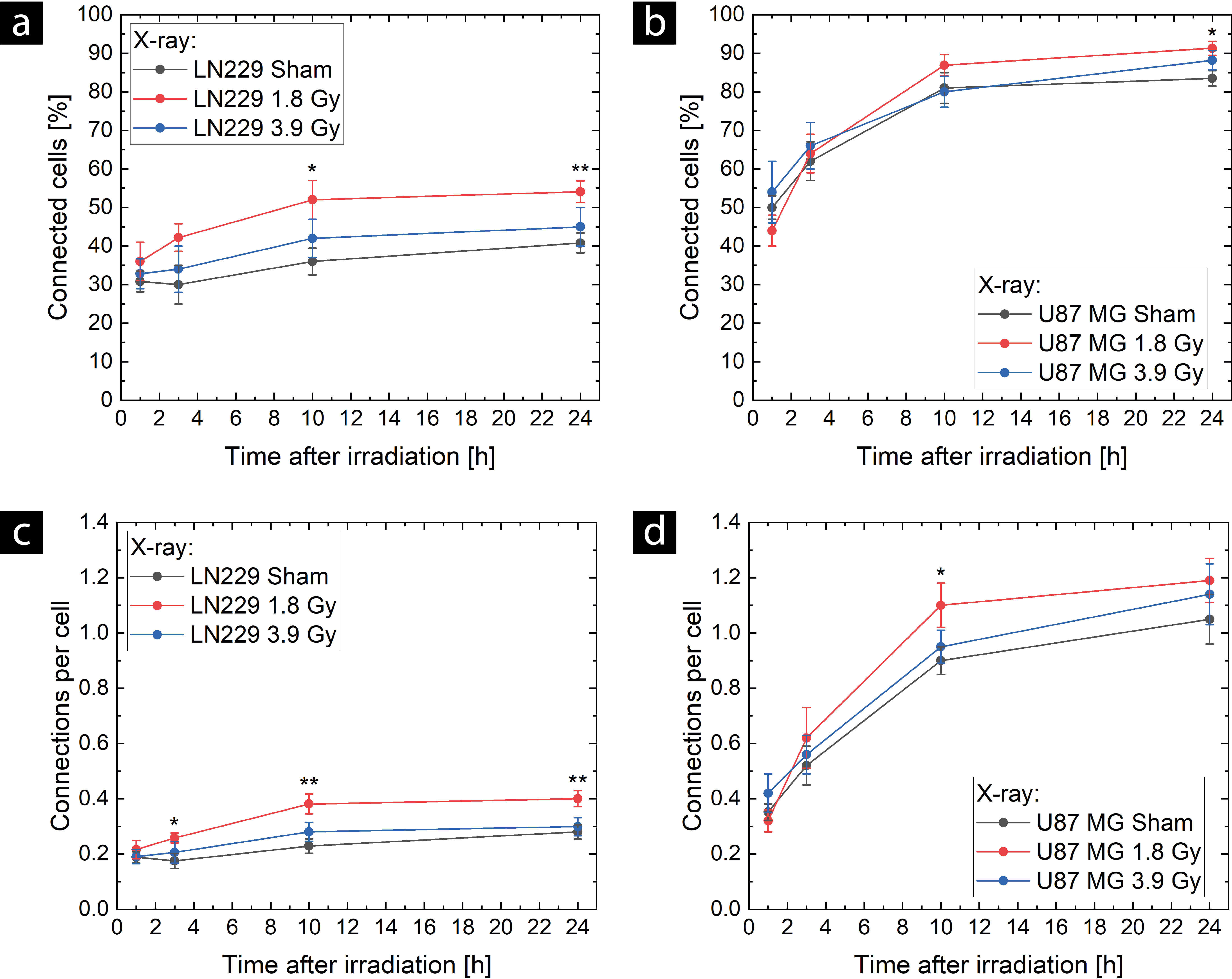 Although the TNT networks differ significantly between LN229 and U87 MG cells, the TNT networks of both cell lines show the same response to X-ray irradiation. In both cell lines, a significant increase in TNT network formation was observed 10 hours after irradiation with a dose of 1.8 Gy. Compared to the sham-irradiated samples, the irradiated samples of both cell lines have more connections per cell at this time point. The number of cells connected by TNTs is also increased in both cell lines in irradiated samples at this time point, significantly in LN229 cells and tending to increase in U87 MG cells. The complexity of the TNT networks is also higher in the irradiated samples, as there are more highly connected cells.