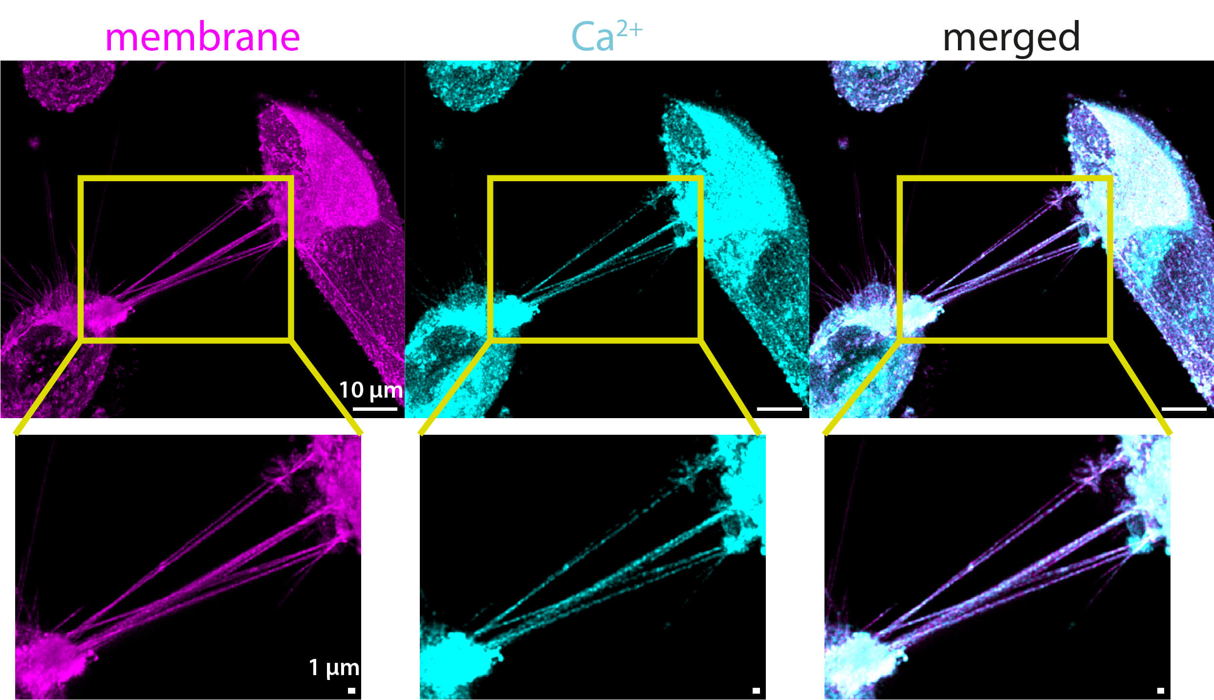 To identify cargoes transported by TNTs, co-staining experiments were performed in which the cell substance of interest was labeled, and the cell membrane was additionally co-labeled using the CellMask™ Green Plasma Membrane Stain to identify the TNTs. Two types of possible cargoes were examined: Ca2+ and mitochondria.