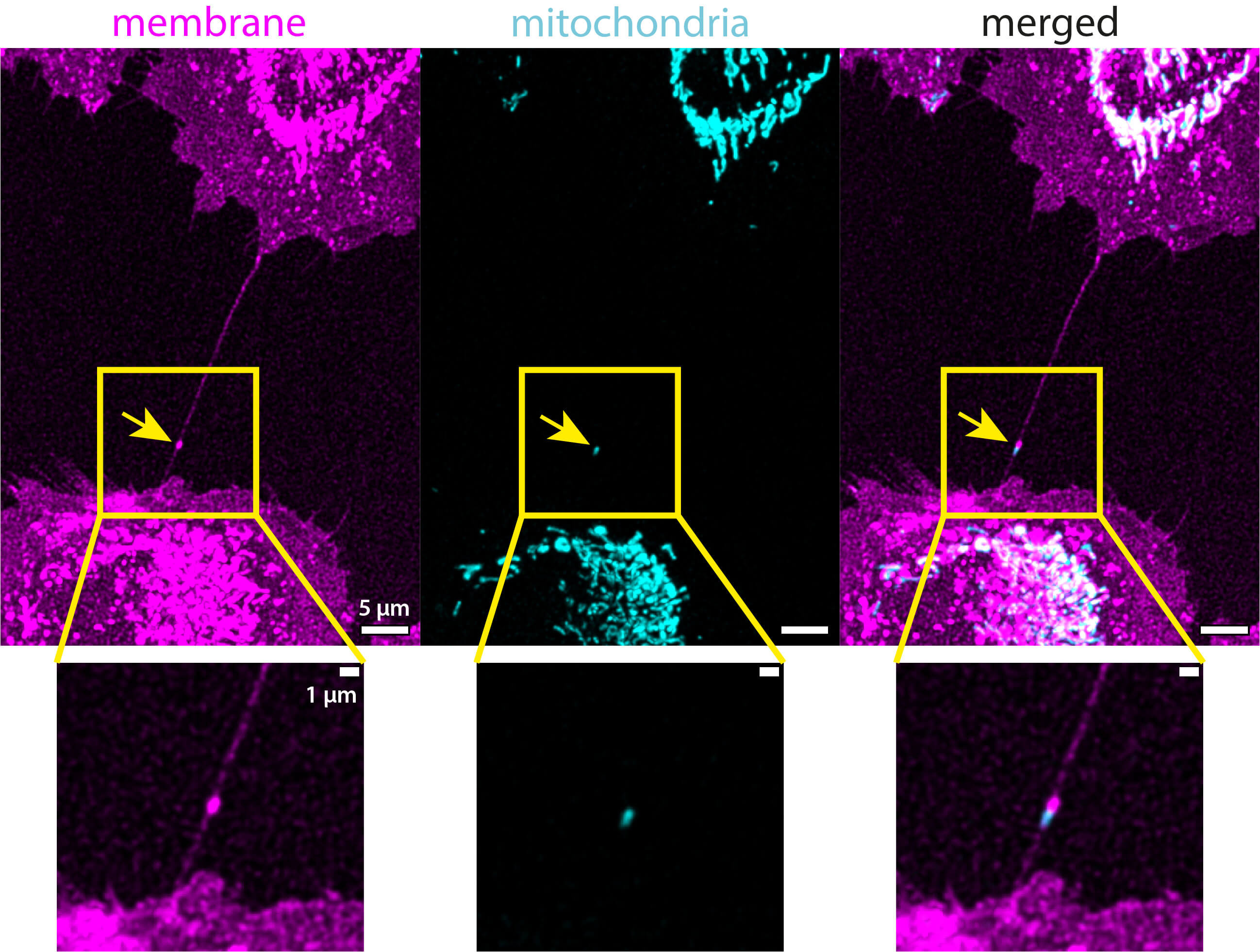 Confocal images (maximum projections) of a TNT containing mitochondria in unirradiated LN229 cells that were co-stained with CellMask™ Green Plasma Membrane Stain (magenta) and TMRE (cyan). The two acquired channels (membrane and mitochondria) are shown, along with the merged image on the right. Magnifications below allow for a closer look at the TNTs. The yellow arrows indicate the position of the mitochondrial signal in the TNT. The mitochondrial spot is shifted toward the spot visible in the membrane channel. This is due to the temporal shift of about 30 seconds between acquiring both channels, which was caused by sequential imaging. The full z-stack is provided in the supplementary materials (see Supplementary Fig. 7). Scale bars: 5 µm for the overview images and 1 µm for the magnifications.