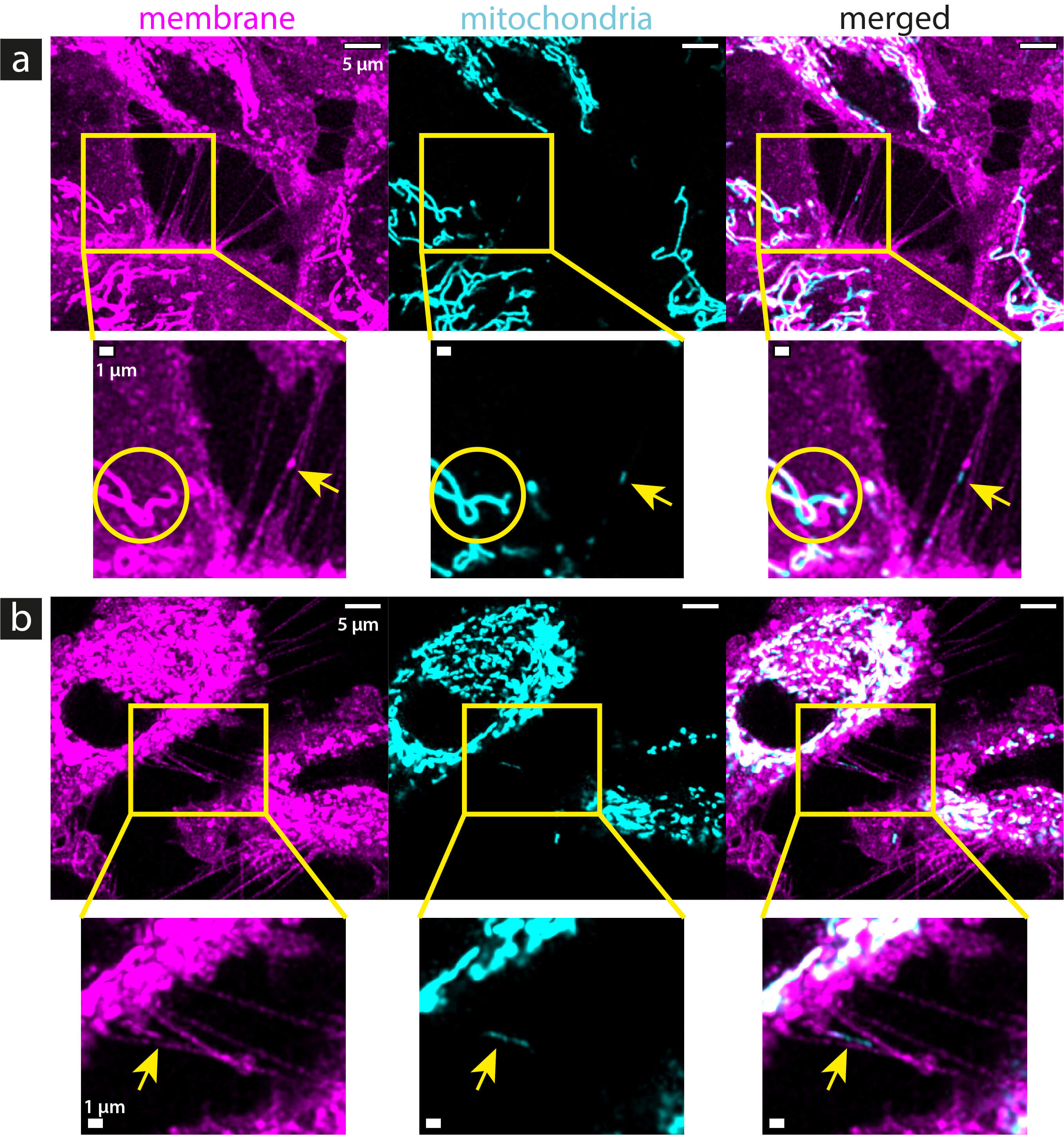 Almost all mitochondrial signals found in the TNTs were concentrated in single spots in the respective tubes (see yellow arrows in Figs. 5,6a). Only a few mitochondrial signals are slightly elongated and distributed along the tube (see Fig. 6b). The merged images show that the mitochondrial signal and the overlapping signal of the membrane channel are slightly shifted towards each other. This is probably caused by the movement of the mitochondria inside the tubes between the acquisition of the two channels, due to the sequential imaging (time shift of about 30 seconds). The yellow circles in Fig. 6a mark a position where the movement of the mitochondrial network between acquisition times is well visible. Here, the shape of the mitochondrial network has changed between the acquisition times of the two channels.