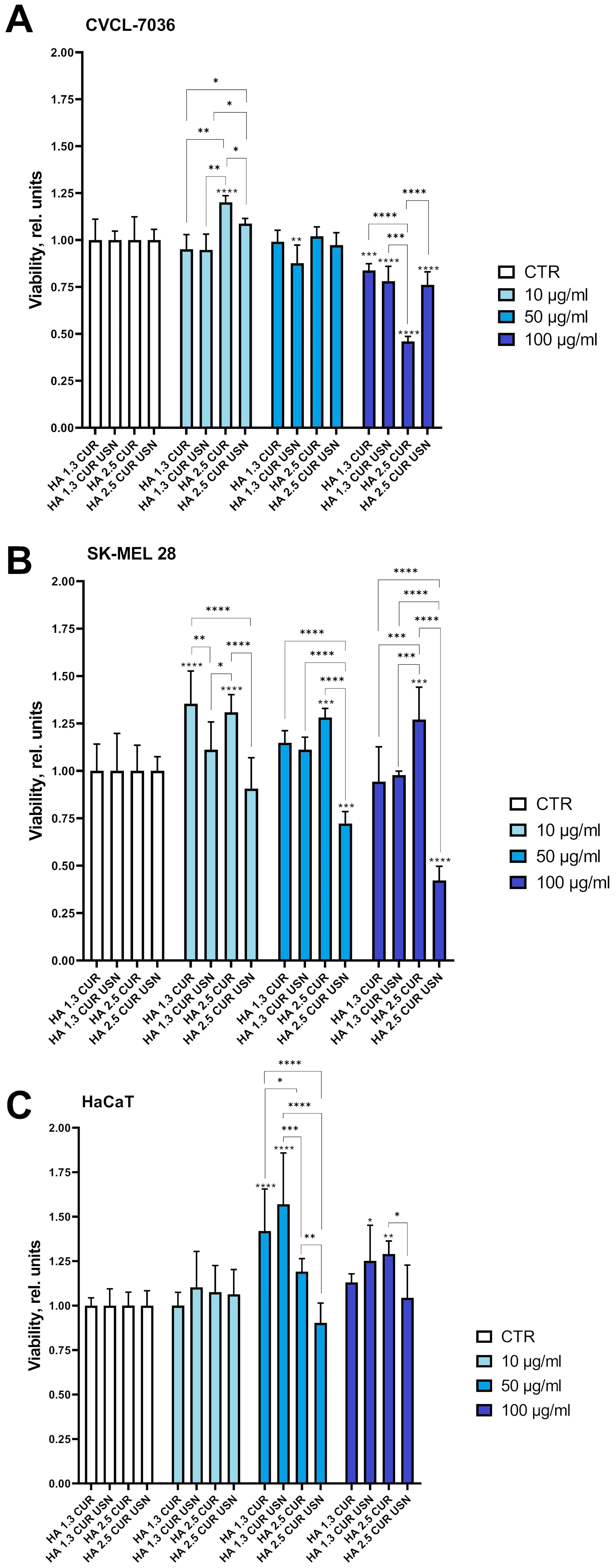 Analysis of the biological activity of the samples with different molecular weights of hyaluronic acid (HA) showed a clear influence of the molecular weight. The samples containing HA with the molecular weight of 1.3 MDa (HA 1.3 CUR and HA 1.3 CUR USN) at the concentration of 50 µg/mL statistically significantly increased the viability of HaCaT cells compared to the control, reaching values of 1.77 and 1.57 relative units, respectively (Fig. 1A). At the same time, the corresponding samples with HA 2.5 MDa (HA 2.5 CUR and HA 2.5 CUR USN) did not show a significant effect on the viability of HaCaT cells at all concentrations studied (Fig. 1B). A similar dependence on the HA molecular weight was also observed in the experiments on melanoma cells. Moreover, the severity of the cytotoxic effect was determined not only by the molecular weight of HA, but also by the composition of the samples, including the presence of CUR and USN. The observed differences may be associated with the peculiarities of cellular interaction and bioavailability of components in systems based on HA of the different molecular weights.