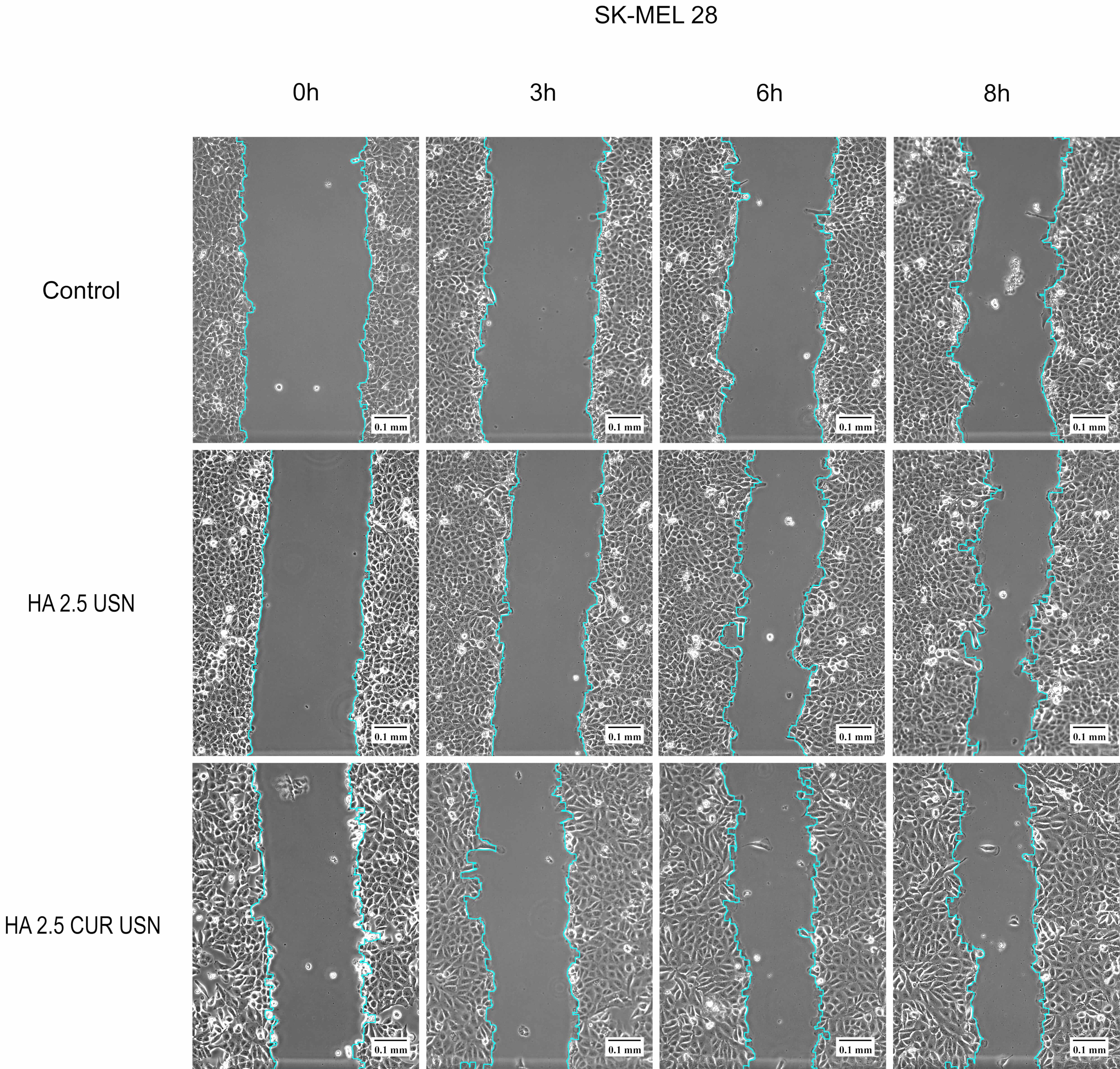 Representative image of a monolayer of SK-MEL 28 melanoma cells with scratches after incubation with HA 2.5 CUR USN and HA 2.5 USN samples at a concentration of 100 µg/mL for 0, 3, 6, 8 h. Fixation of the scratch area. The edges of the scratch are outlined with a turquoise curve. Scale bar = 0.1 mm.
