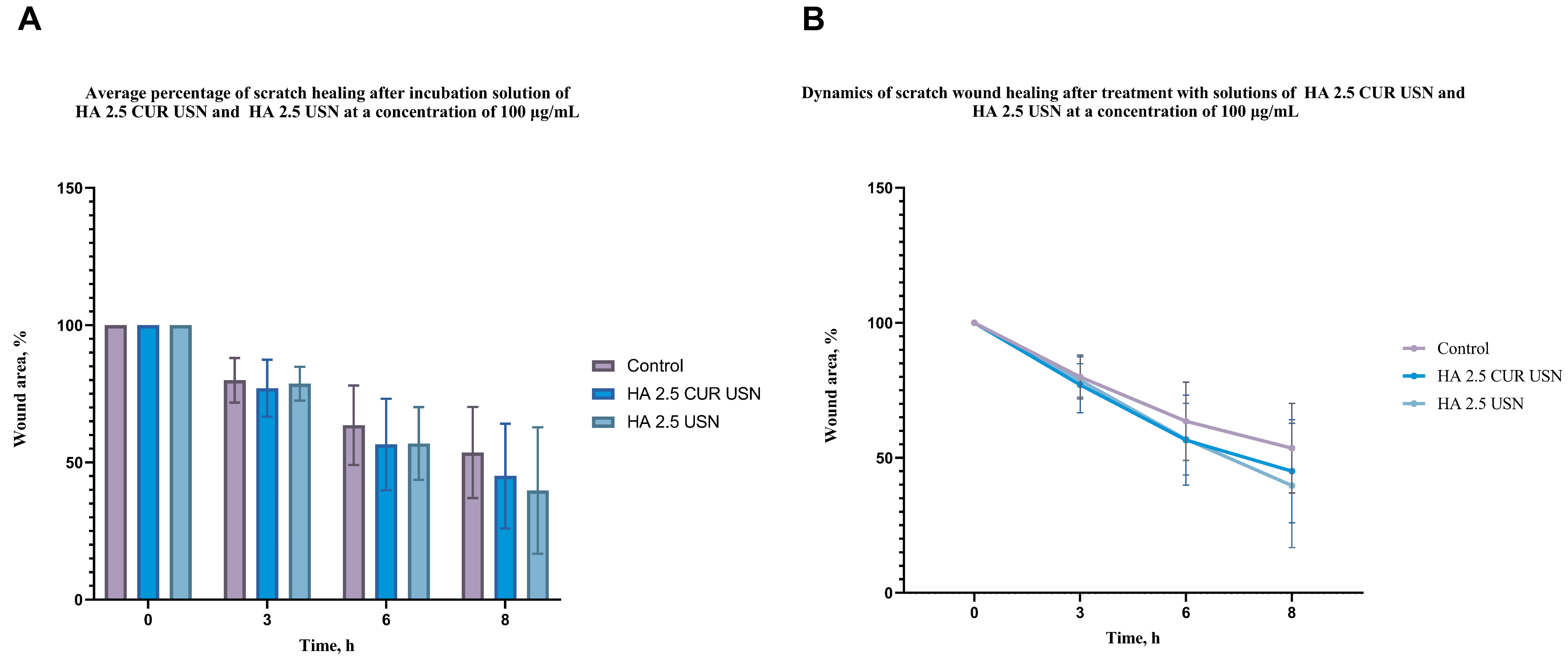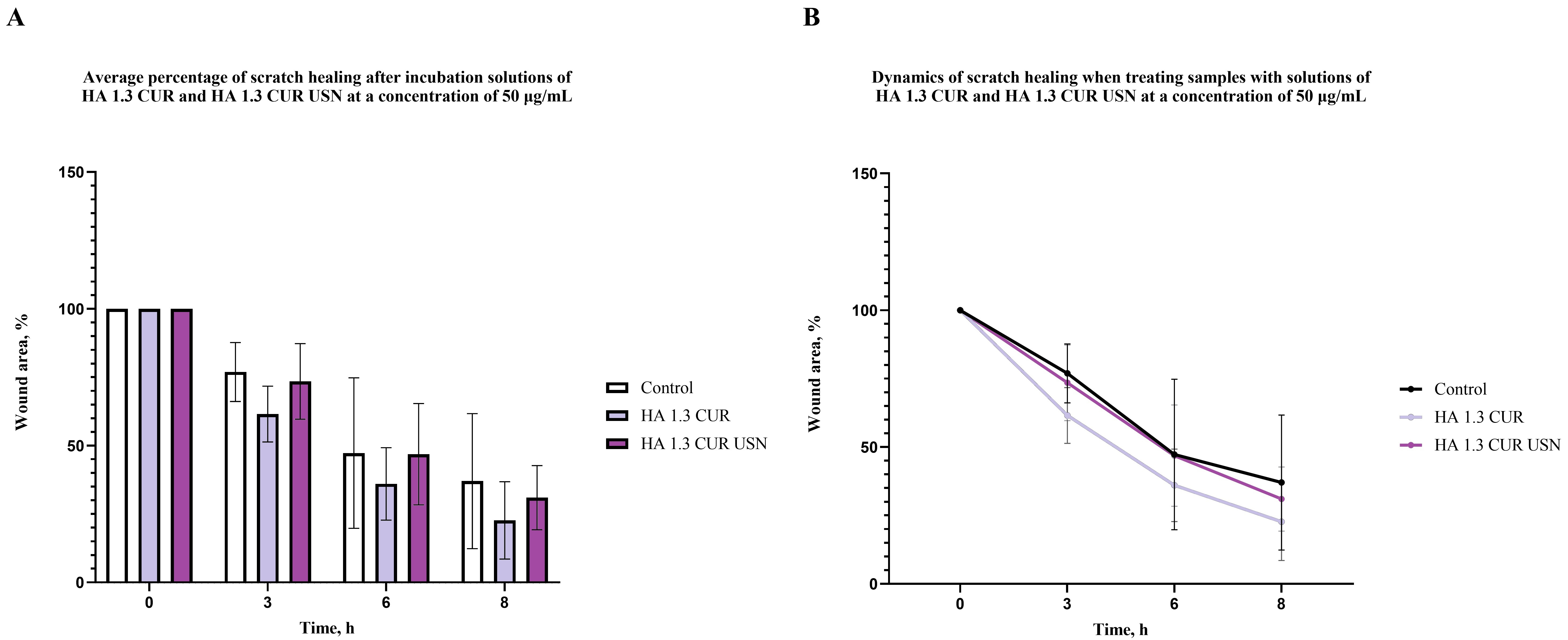 The analysis of cell migration demonstrates the effect of the different samples on the initial stages of scratch healing. To simulate the effect of the sample on normal keratinocytes during the wound closure with topical application, a comparison was made between the control group and two cell cultures treated with HA 1.3 CUR and HA 1.3 CUR USN sample solutions at a concentration of 50 µg/mL. The scratch area measurements were calculated from the micrographs shown in Fig. 5. The average percentages of the scratch closure are summarized in Fig. 6A,B, which illustrate the reduction of the dynamics in the scratch area over time.