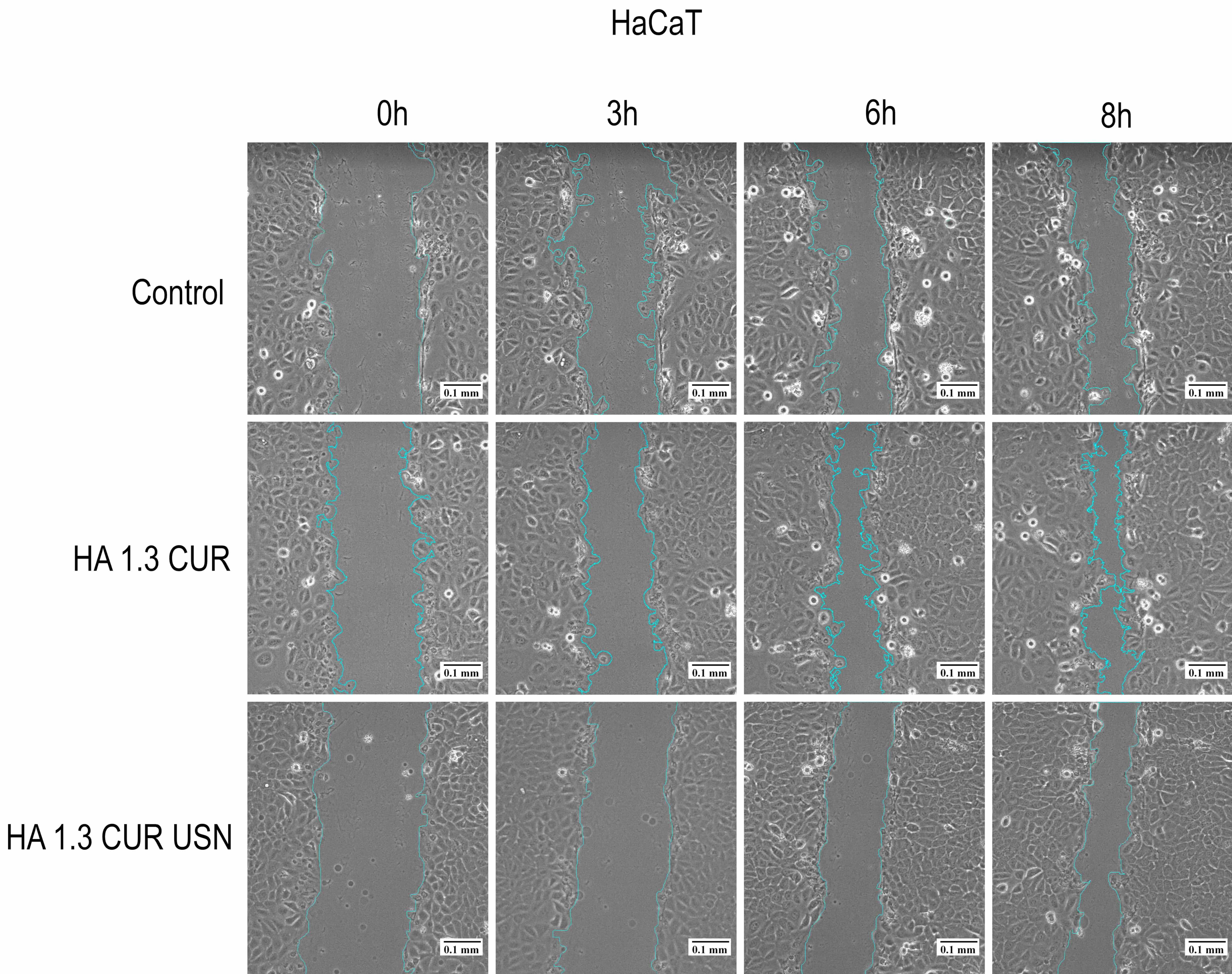 Representative image of a monolayer of HaCaT cells with scratches after the incubation with the samples of the HA 1.3 group at the concentration of 50 µg/mL for 0, 3, 6, 8 h. Fixation of the scratch area—the edges of the scratch are marked with a turquoise curve. Scale bar = 0.1 mm.