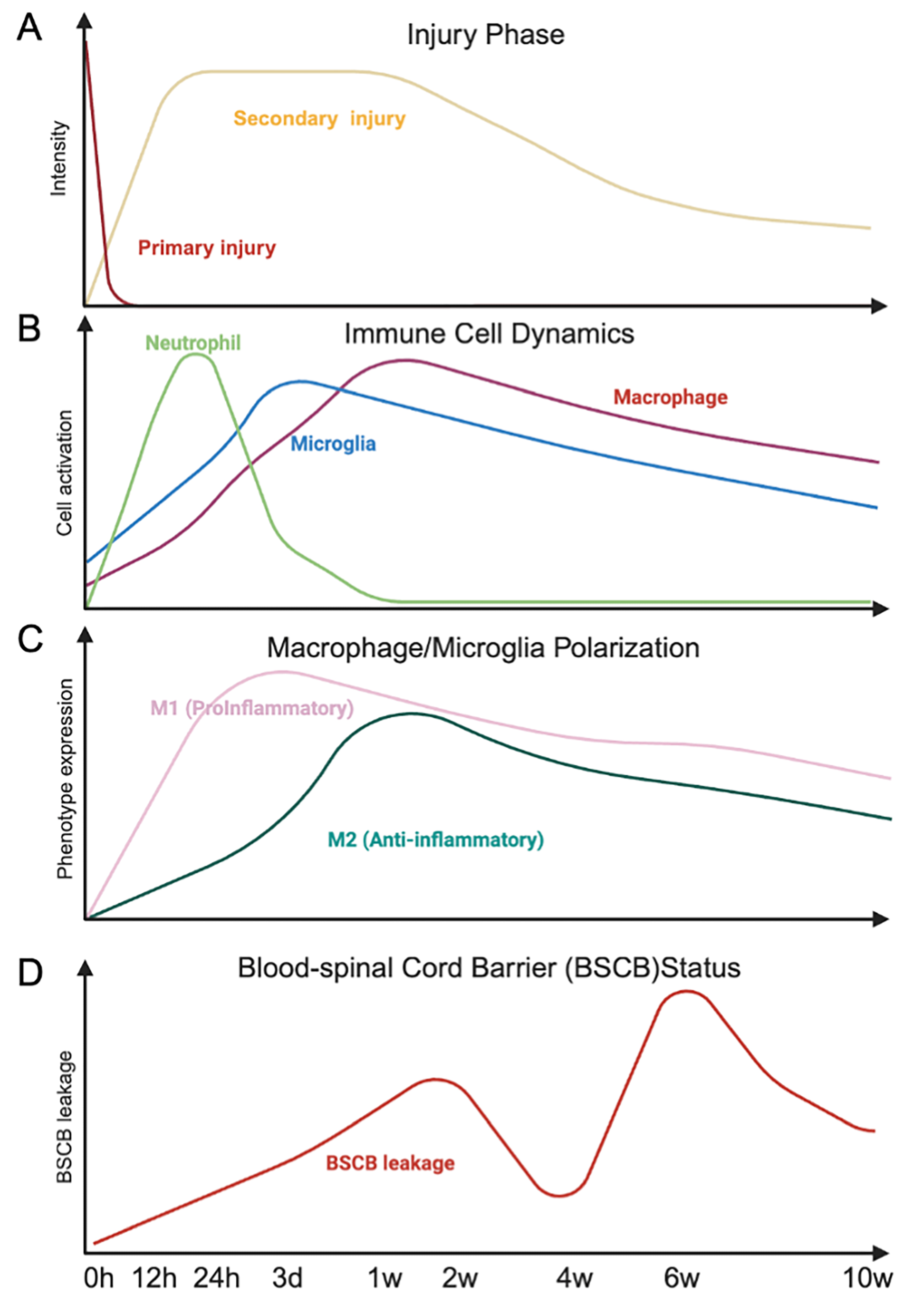 Temporal dynamics of injury progression, immune responses, and blood–spinal cord barrier disruption after spinal cord injury. Schematic representation of the temporal profile of spinal cord injury (SCI). The upper panel (A) illustrates the rapid primary injury followed by a prolonged secondary injury phase. Subsequent panels depict immune cell dynamics (B), including neutrophil infiltration, microglial activation, and macrophage accumulation, as well as macrophage/microglia polarization from proinflammatory (M1) to anti-inflammatory (M2) phenotypes (C). The lower panel (D) shows the time-dependent increase and partial recovery of blood–spinal cord barrier (BSCB) leakage over 10 weeks after injury. Created in BioRender. Nakazaki, M. (2026) https://BioRender.com/z0lx89y.