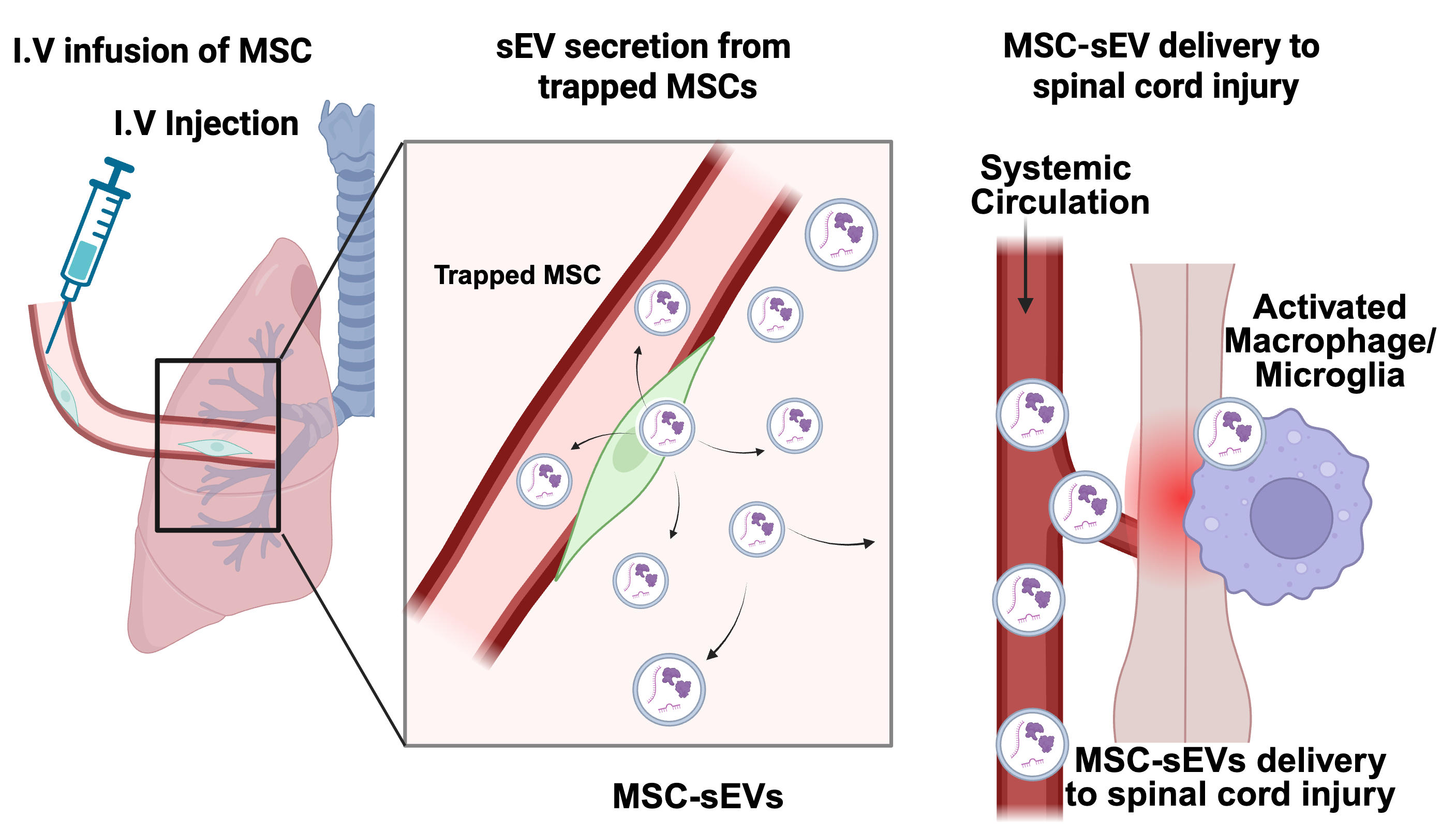 Proposed mechanism of MSC-derived small extracellular vesicle (EV) delivery to the injured spinal cord following systemic administration. Following intravenous (I.V.) infusion, mesenchymal stromal/stem cells (MSCs) do not traffic directly to the injury site; instead, due to their relatively large size (15–30 µm), they become entrapped within the lung microvasculature, where they survive transiently for 2–3 days (left panel). During this period, the trapped MSCs continuously secrete small extracellular vesicles (MSC-sEVs, 30–200 nm in diameter) into the systemic circulation (middle panel). These circulating MSC-sEVs subsequently home to sites of tissue injury, including the damaged spinal cord, where they extravasate through the disrupted blood-spinal cord barrier (BSCB) and accumulate within the lesion microenvironment (right panel). At the injury site, MSC-sEVs are preferentially internalized by activated macrophages and microglia. The internalized sEVs deliver bioactive cargo, including immunomodulatory microRNAs, to reprogram macrophage/microglial function and promote a reparative microenvironment conducive to neural repair [6]. Created in BioRender. Nakazaki, M. (2026) https://BioRender.com/6kegcsw.