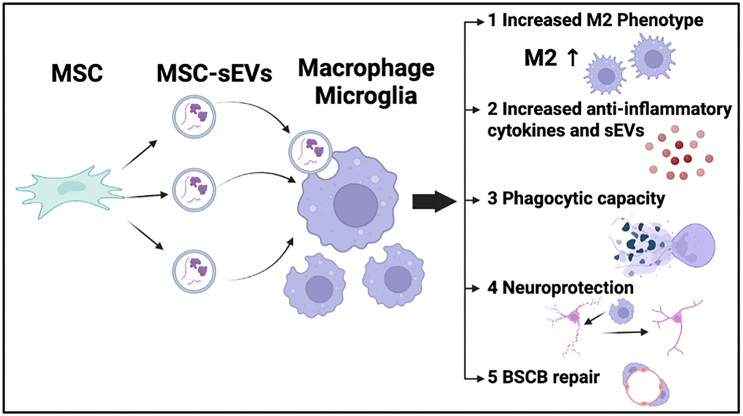 Macrophages and microglia are central regulators of the neuroimmune and vascular responses that shape the trajectory of spinal cord repair. Evidence summarized in this review indicates that MSC-sEVs exert their therapeutic efficacy primarily through bidirectional interactions with these myeloid populations. By promoting and maintaining anti-inflammatory, efferocytic and pro-resolving phenotypes, MSC-sEVs attenuate cytokine-driven injury, enhance debris clearance, and restore blood–spinal cord barrier integrity. The resulting stabilization of the neurovascular unit provides a permissive environment for neuronal survival, axonal growth and remyelination.