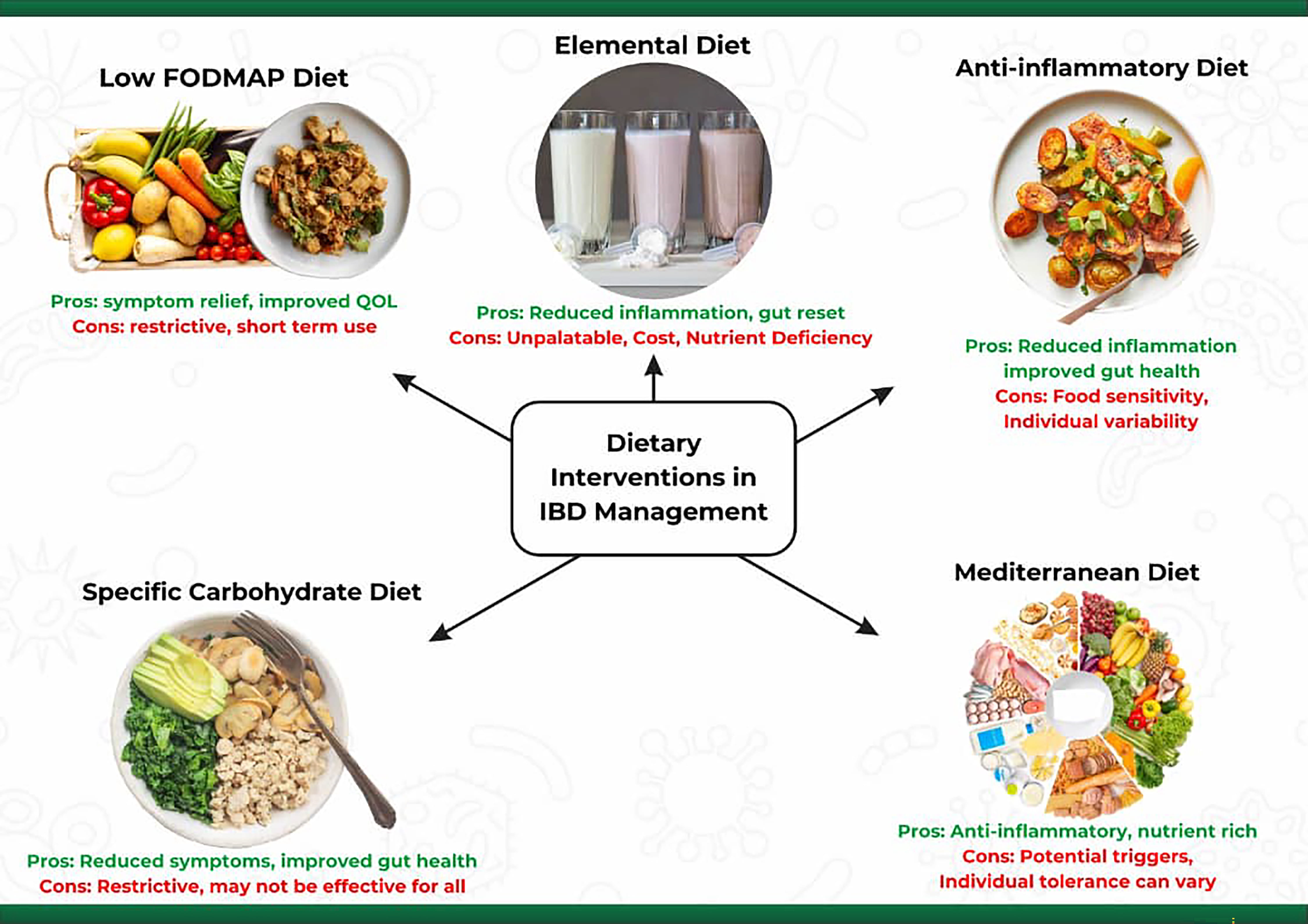Summary of major dietary interventions used in IBD management, illustrating potential benefits and limitations of commonly prescribed dietary patterns and emphasizing the variability in patient response. IBD, Inflammatory bowel disease.