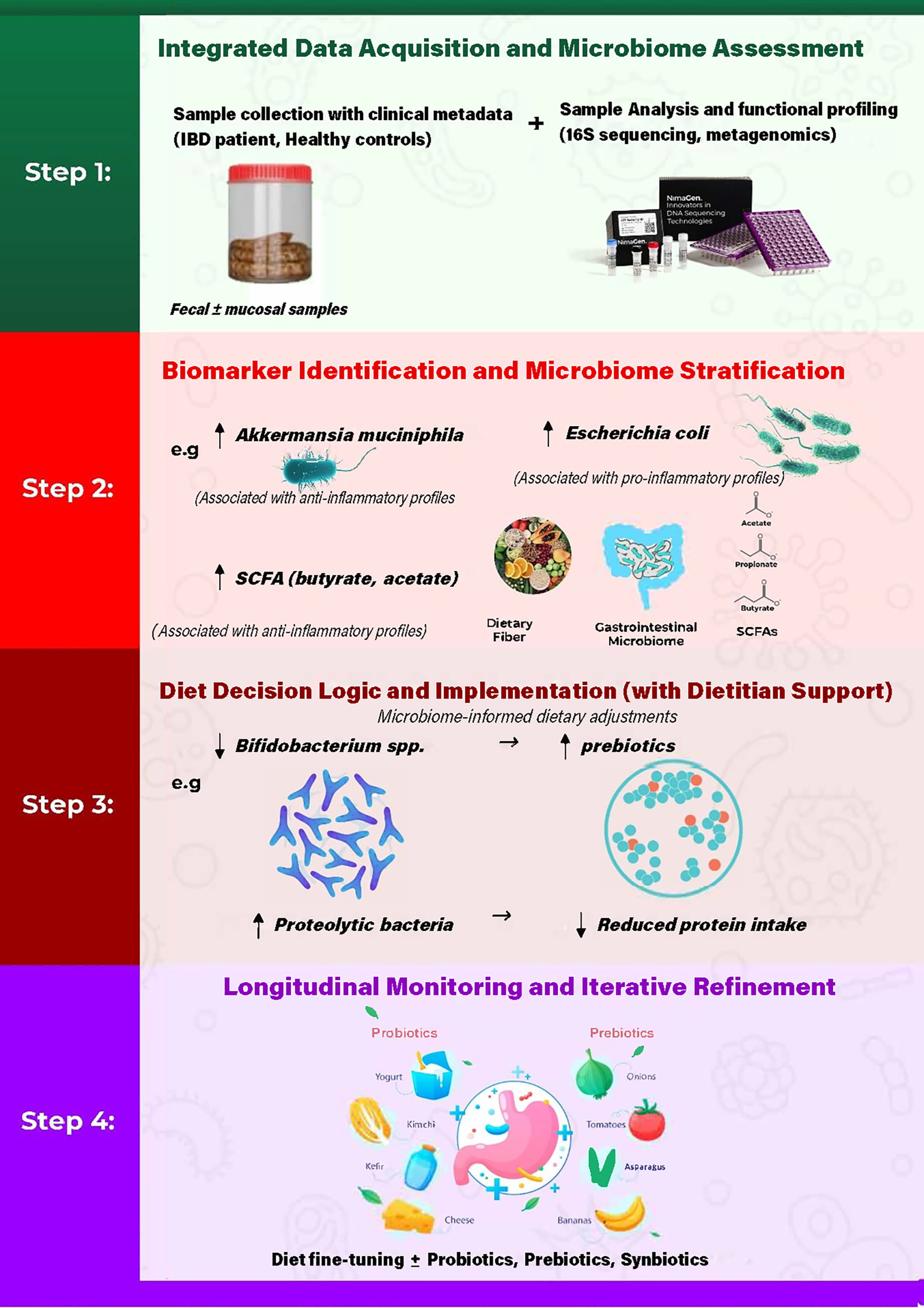 Following biomarker identification and microbiome stratification, dietary recommendations are then developed using structured decision logic that integrates microbial features with clinical context. This step translates microbiome-informed signals into personalized dietary strategies while accounting for disease activity, medication use, nutritional status, and patient-specific constraints.