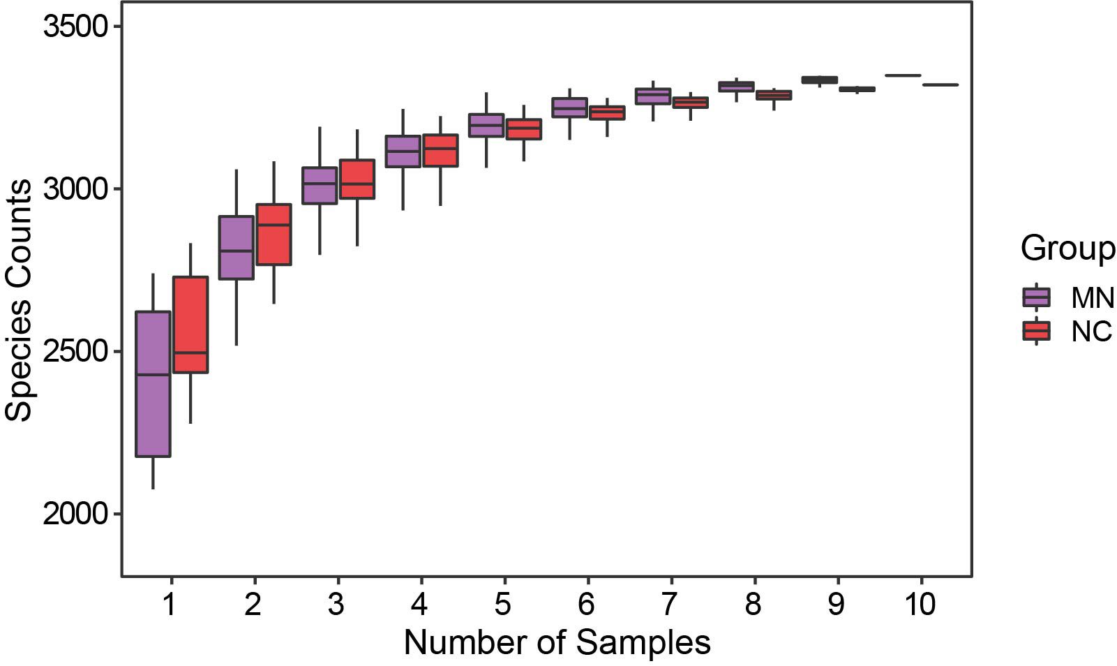 Species richness rarefaction curves for the MN and NC groups, showing the relationship between sequencing sample size and observed species counts.
