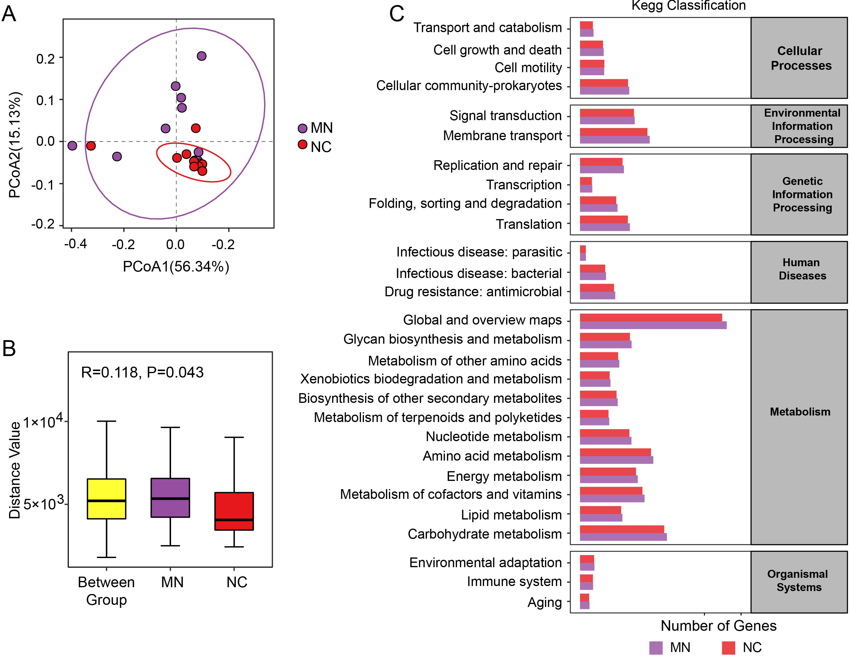 Functional differences of gut microbiota between the MN and NC groups. (A) Principal coordinate analysis (PCoA) based on Bray-Curtis distances illustrating the overall differences in metagenomic functional profiles between the MN and NC groups. (B) Analysis of similarities (ANOSIM) showing the variation in microbial functional composition among and within groups. (C) Kyoto Encyclopedia of Genes and Genomes (KEGG) functional classification of predicted microbial pathways across categories including metabolism, genetic information processing, environmental information processing, cellular processes, human diseases, and organismal systems.