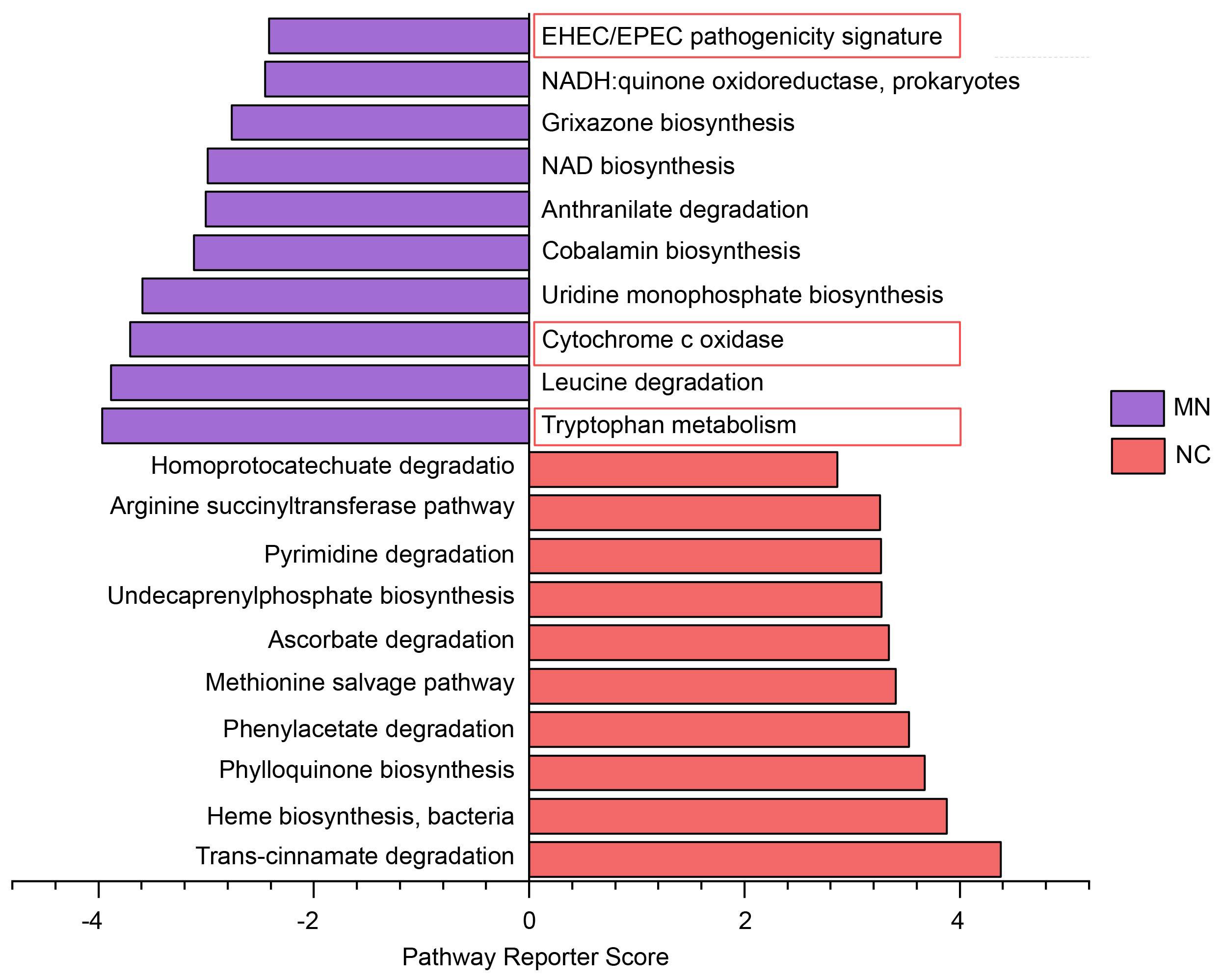 To further explore functional alterations of the gut microbiota between the MN and NC groups, KEGG pathway enrichment analysis was performed to identify significantly enriched pathways. As shown in Fig. 4, the MN group exhibited enrichment in pathways associated with bacterial pathogenicity and redox metabolism, such as Enterohemorrhagic E. coli/Enteropathogenic E. coli (EHEC/EPEC) pathogenicity signature, reduced nicotinamide adenine dinucleotide (NADH): quinone oxidoreductase (prokaryotes), Nicotinamide adenine dinucleotide (NAD) biosynthesis, anthranilate degradation, and cytochrome c oxidase. Notably, tryptophan metabolism was also enriched in the MN group, representing a key pathway involved in immune modulation and host-microbe interactions. By contrast, the NC group was enriched in pathways related to amino acid and cofactor metabolism, such as leucine degradation, pyrimidine degradation, heme biosynthesis (bacteria), phylloquinone (vitamin K1) biosynthesis, methionine salvage pathway, and trans-cinnamate degradation.