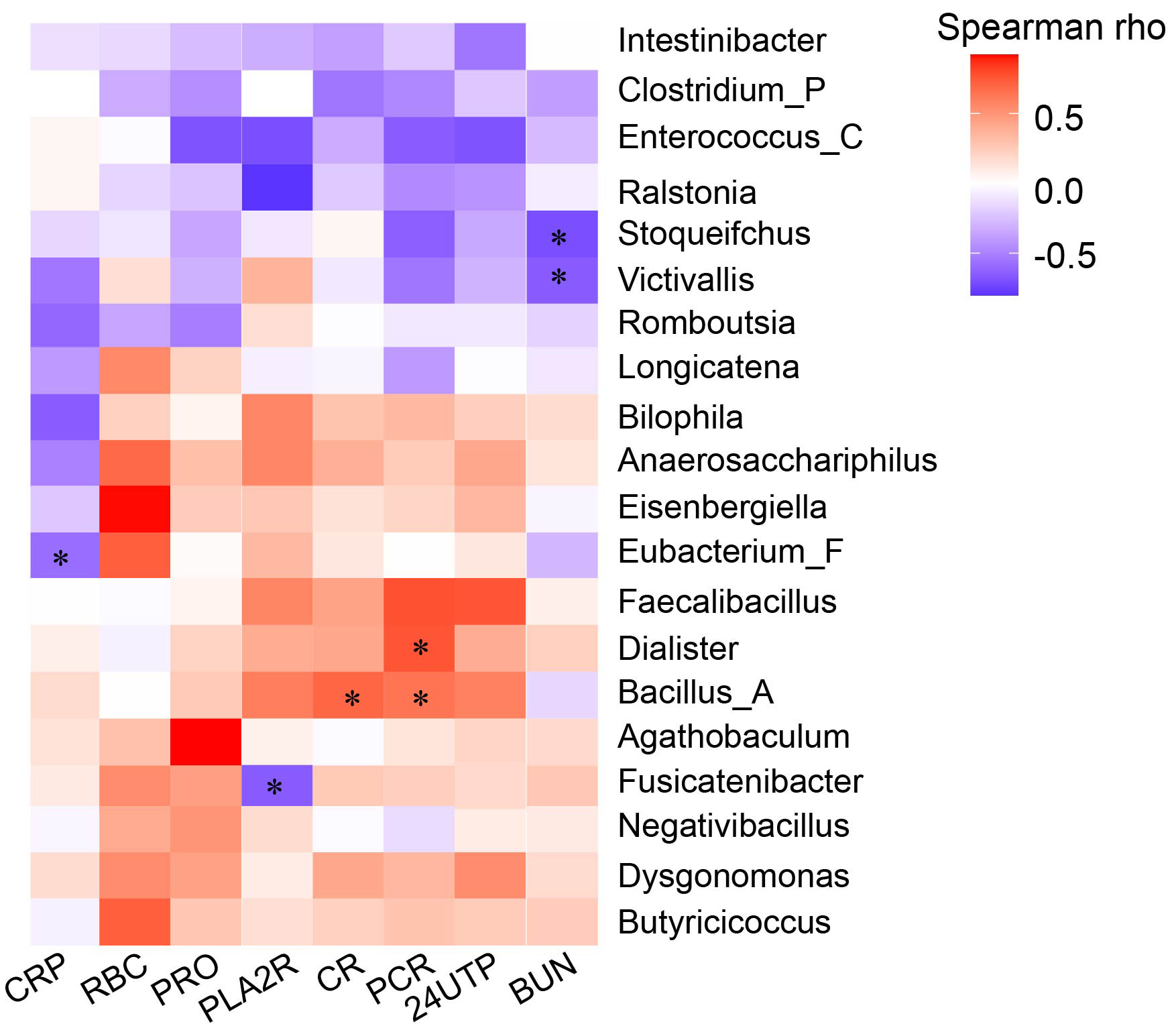 This study found that certain gut microbial genera are associated with renal function indicators in patients with MN. Fusicatenibacter showed a negative correlation with PLA2R, suggesting that this butyrate-producing bacterium may exert immunomodulatory effects on membranous nephropathy or mitigate PLA2R-mediated autoimmune-related immune activation. Conversely, Bacillus_A had a significant positive correlation with CR and PCR, suggesting that its enrichment may reflect impaired renal filtration or increased proteinuria. Some Bacillus species can produce endotoxins or pro-inflammatory metabolites [41, 42], which may exacerbate renal injury and inflammatory responses.
