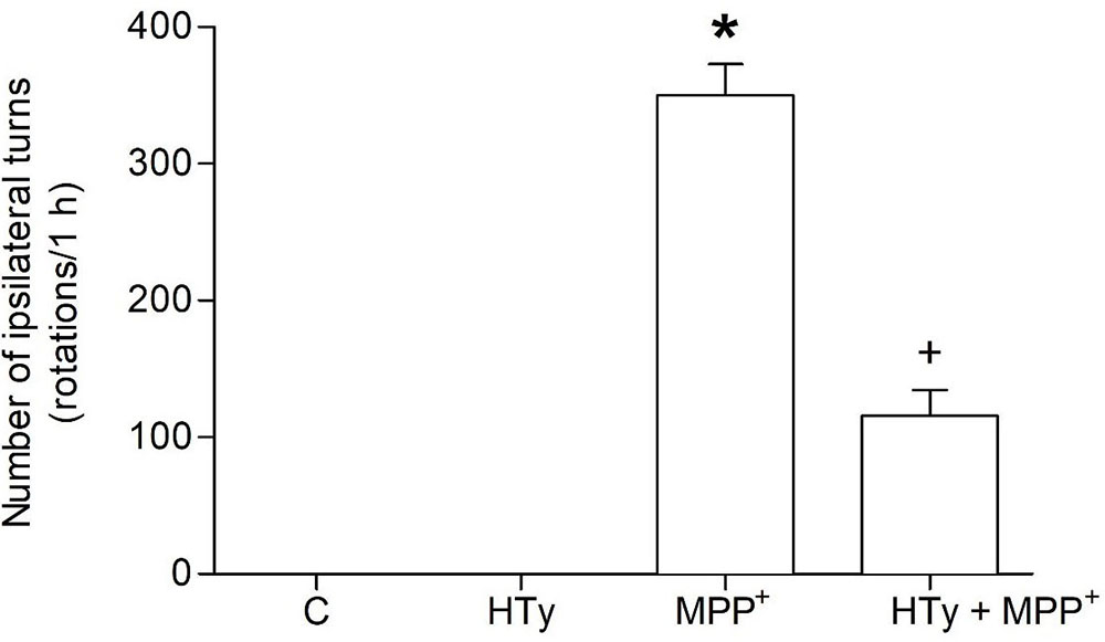 Behavioral assessment was carried out to evaluate the neuroprotective effect of the intravenous pretreatment with HTy (1.5 mg/kg) against long-term MPP+-induced neurotoxic effect. As compared to the C or HTy-alone groups, MPP+ administration produced a marked increase on circling behavior (350 ± 22 rotations/h) after apomorphine administration (see Figure 1). The HTy pretreatment significantly prevented (p = 0.004) the effect of apomorphine-induced circling-behavior in the animals that received MPP+ (HTy + MPP+ group). The number of ipsilateral turns was reduced by 65 % (123 ± 15 rotations/h), when compared against rats that were treated only with the neurotoxin (MPP+ group).