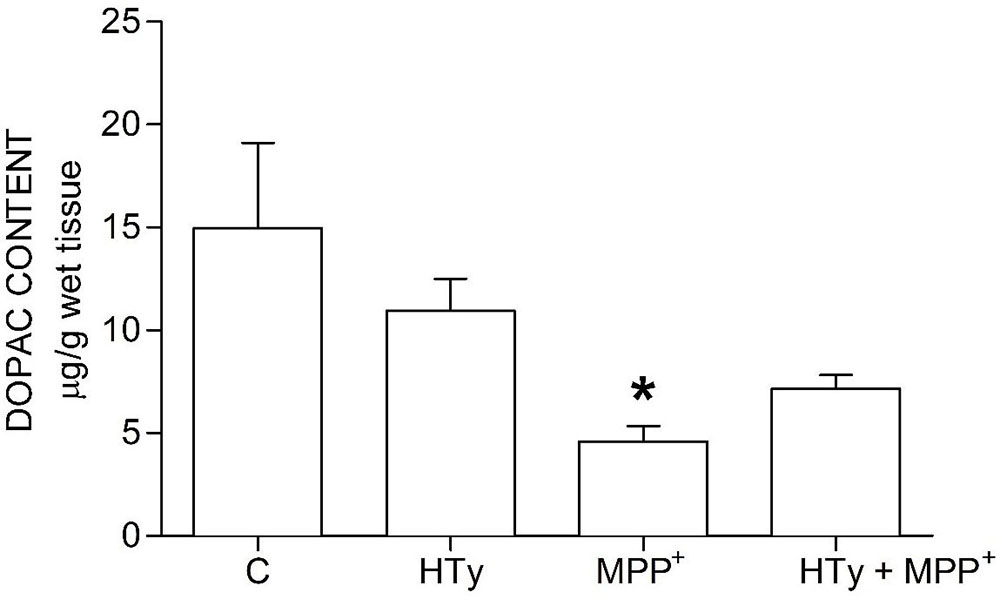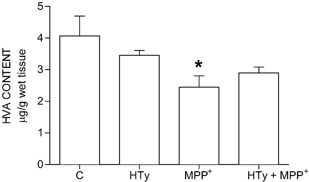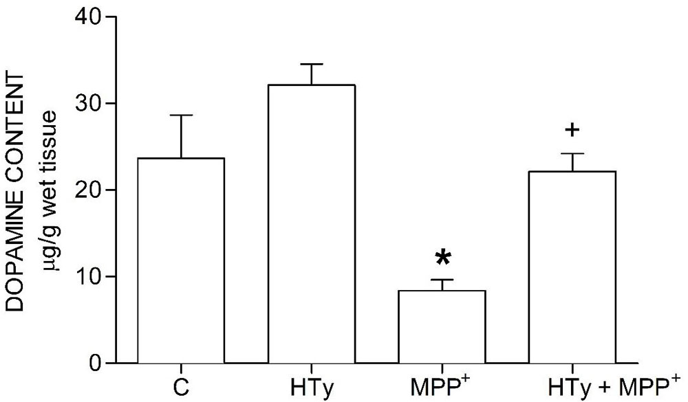 The neuroprotective effect of HTy reducde MPP+-induced striatal dopamine depletion (Figure 2). HTy, administered at 1.5 mg/kg to control rats did cause any change in dopamine content (29.58 ± 1.5 µg/g wet tissue), as compared to the values of the control group (23.66 ± 4.9 µg/g wet tissue). However, animals that were treated with MPP+ showed a significant reduction (70 %) (8.31 ± 1.2 µg/g wet tissue) of striatal dopamine (p = 0.001), as compared to control values. Administration of HTy to MPP+-infused rats (HTy + MPP+ group) fully restored dopamine values to the levels that were observedin the control group (20.27 ± 1.9 µg/g wet tissue) (P=0.007, vs MPP+ group). After treatment with HTy, the striatal dopamine content was 45 % higher than the values obtaomed in the MPP+-only group.