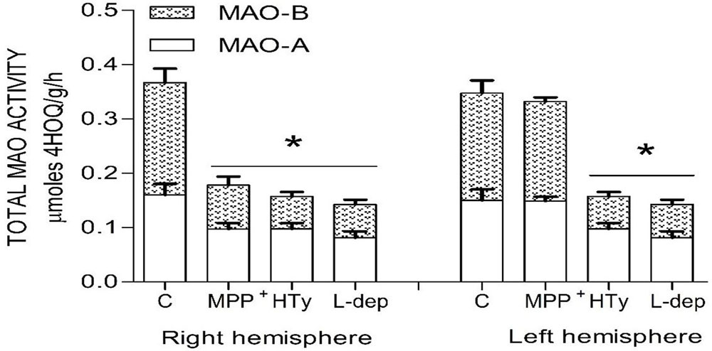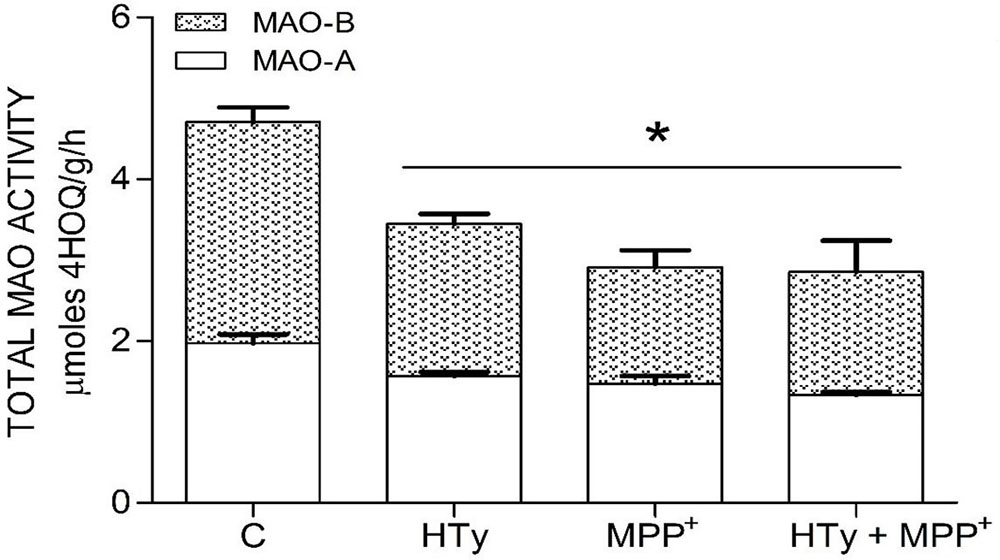 In conclusion, we demonstrated that, at the same dose, HTy inhibits striatal MPP+ neurotoxicity and exerts neuroprotective effect on both isoforms of MAO. Given that the adult human brain has high levels of MAO-B protein, these findings suggest that natural substrates thtat contain a high level of HTy should protect the degeneration of the dopaminergic neurons in the substantia nigra pars compacta (SNc) in PD (37).