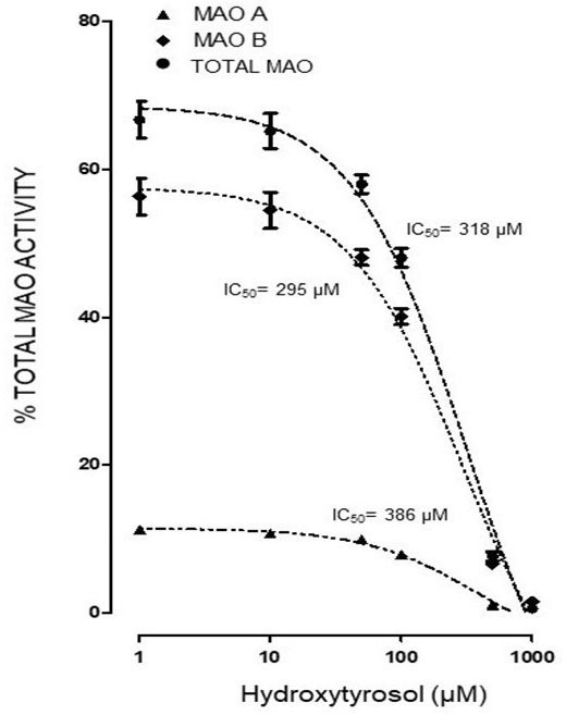 The biological effects of HTy have been attributed to its ability to donate electrons from the hydroxyl groups in the ortho position and the subsequent formation of stable intramolecular hydrogen bridges with the phenoxylic radicals, as well as the catechol ring of its chemical structure that favors a metal-chelating effect (32-35). As shown in the present study, additional mode of action for HTy involves an inhibitory effect that HTy exerts on enzymes which are involved in the catabolism of catecholamines, specifically MAO-B. Catabolism of dopamine by the action of MAO produces hydrogen peroxide as a by-product, that in turn, may serve as a substrate for production of the cytotoxic hydroxyl radical by Fenton`s chemistry (36). As HTy inhibits MAO at similar concentrations as those employed in the present study, this action may be important in reducing formation of hydroxyl radicals in vivo. As has been reported for other polyphenolic compounds derived from vegetable species, the preservation of the dopamine levels by HTy, might be due to its inhibitory effect on MAO isoforms, mainly MAO-B (12). This enzymatic inhibition suggests a decrease in the catabolism of DA, as well as a decreased generation of ROS (5). Clinical studies have reported an increase in the oxidation of DA by MAO-B in the brain of patients with Parkinson's disease and such an effect might lead to the inhibition of both the exogenous neurotoxins such as MPP+ as well as endogenous neurotoxins such as H2O2 (14). Studies using isolated mitochondria from rat brain tissue have confirmed the inhibitory effect of HTy on MAO-B, reporting an IC50 of 16.3 μM, a level which is 11.9 times lower than the IC50 that was obtained in this study (194 μM).