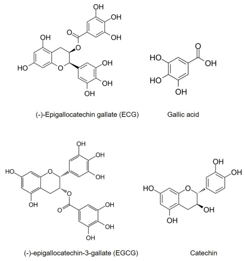 Figure 1Chemical structures of epigallocatechin gallate (EGCG) and related compounds.