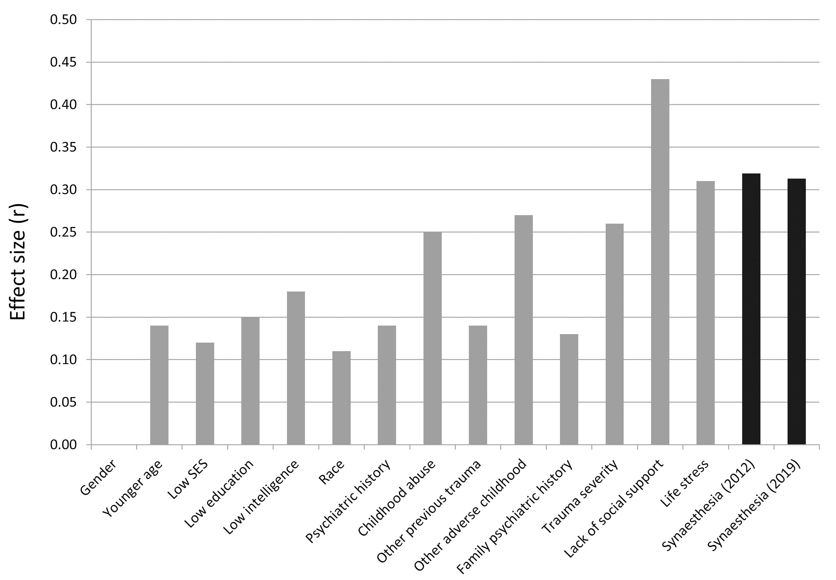 Fig. 1.Risk factors associated with PTSD in military veterans. Gray bars are reproduced from the meta-analysis of Brewin et al. [3] using weighted average r. The black bars show data from the two published studies on synaesthesia and PTSD [1, 2]. Note: odd-ratios reported in these papers were translated to r effect sizes using the formulae according to Borenstein et al. [7].