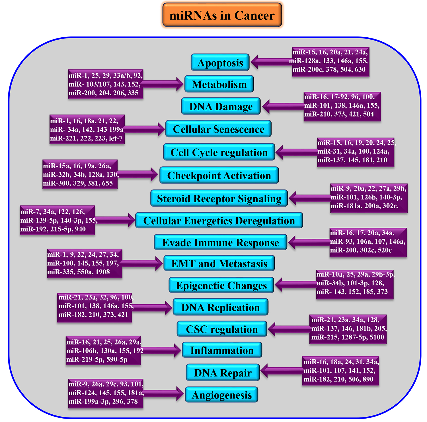 Fig. 2.Dysregulation of miRNAs in various cancers. EMT, Epithelial-Mesenchymal Transition; CSC, Cancer Stem cells.