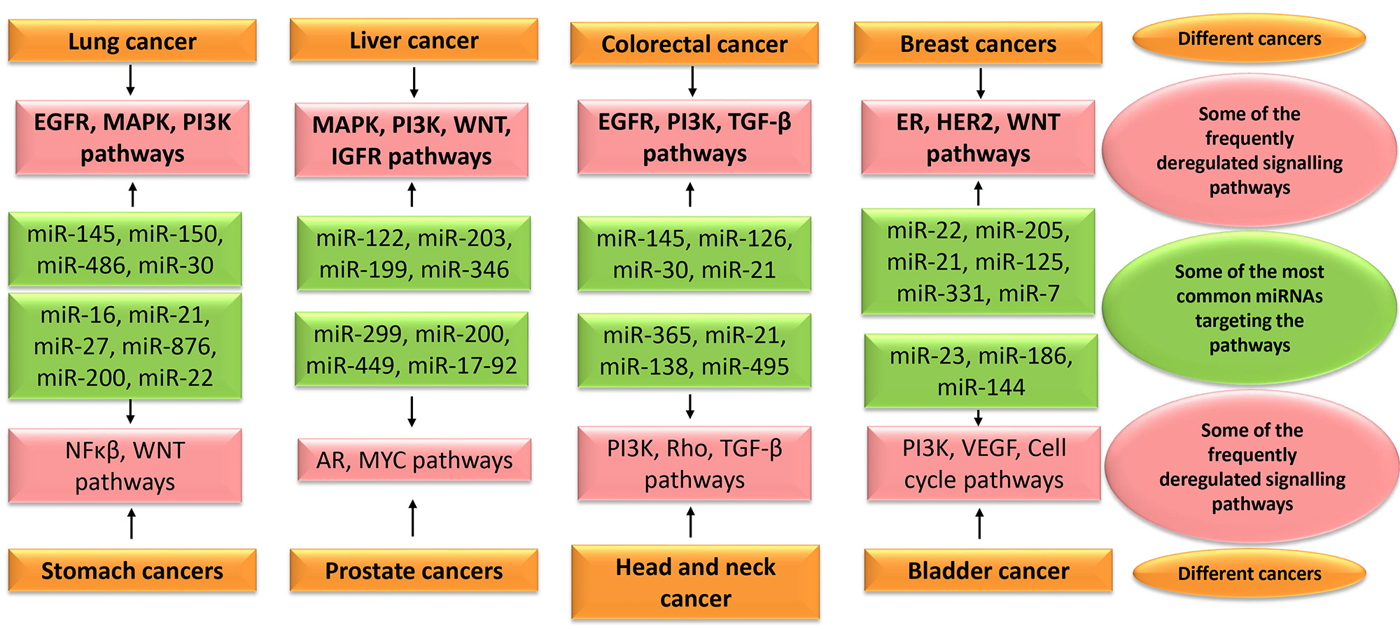 Fig. 3.Some of the most common miRNAs targeting the frequently deregulated signalling pathways in various cancers. EGFR, epidermal growth factor receptor; MAPK, mitogen-activated protein kinase; PI3K, Phosphoinositide 3-kinase; IGFR, Insulin-like growth factor receptor; TGF, transforming growth factor; ER, estrogen receptor; HER2, human epidermal growth factor receptor 2; AR, Androgen receptor; VEGF, Vascular endothelial growth factor.