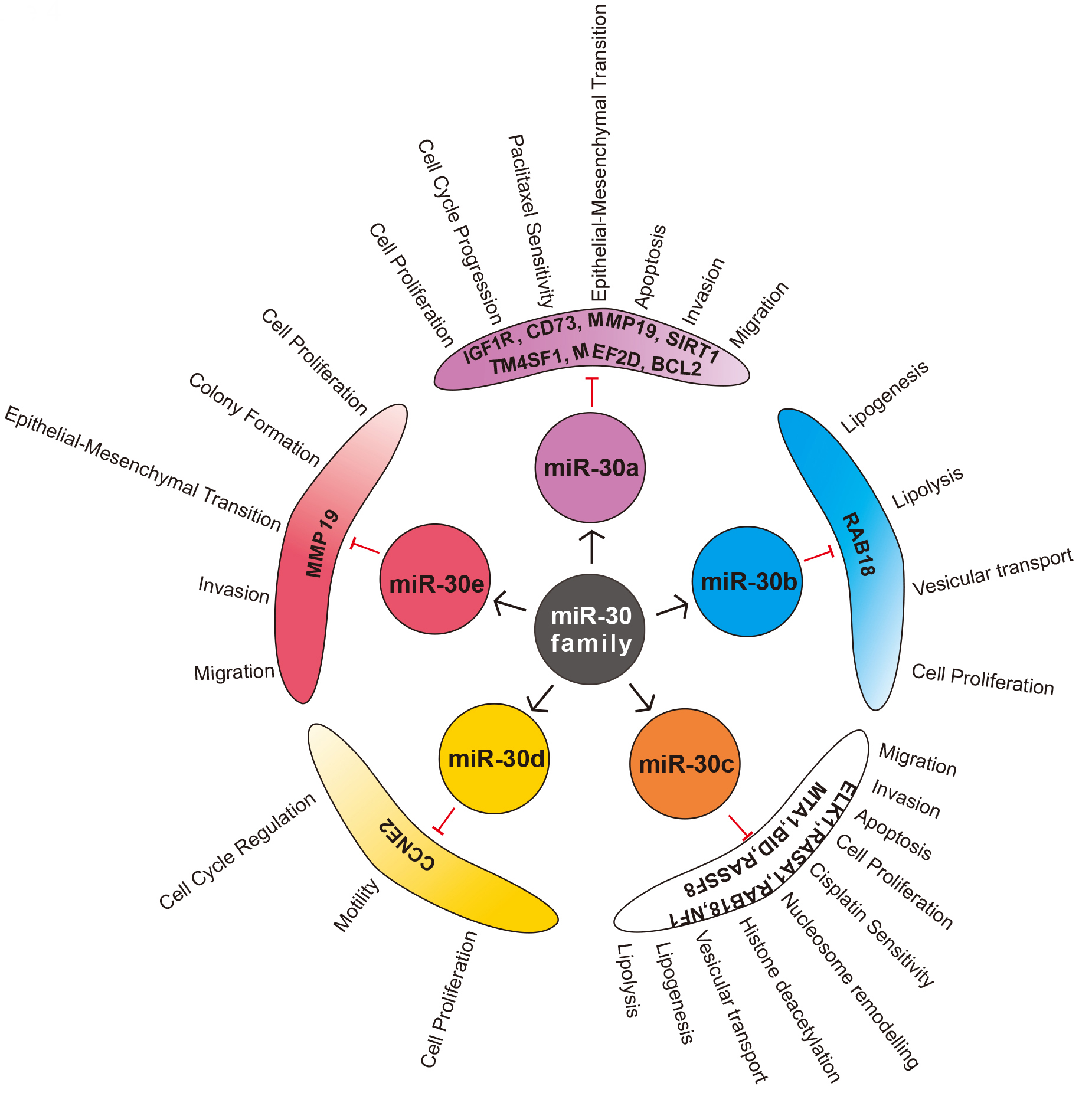 The role of miR-30 has been observed in various aspects of human physiology. Its expression in mammalian cells was first discovered in the HeLa cell line by Lagos-Quintana et al. [54], along with 21 other novel miRNAs. The sister miRNAs are involved in the regulation of various physiological signalling pathways, including osteogenic differentiation and development [55, 56], as well as animal reproductive development [57]. Besides, miR-30 was also shown to play a crucial role in lipogenesis and adipose differentiation [58]. miR-30b and miR-30c are involved in vascular development and angiogenesis [59]. They favour epithelial phenotype by silencing genes involved in mesenchymal transition [60]. These studies suggest the significance of miR-30 family in development and differentiation of various cell types. The prominent physiological involvement of miR-30 shows that their deregulation is involved in several pathological conditions, including cancer [61].