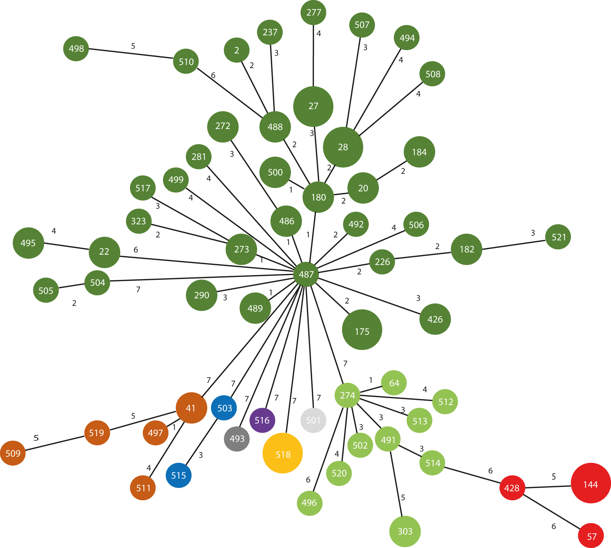 Fig. 1.MLST-based Minimum Spanning Tree of 101 Achromobacter isolates. Sequence types (STs) were based on seven housekeeping genes as determined by whole genome sequencing. The numbers in the nodes indicate the STs assigned by PubMLST (www.pubmlst.org). The numbers on the lines between the nodes indicate the number of loci differences between two STs. Distances between the nodes are not drawn to scale. Dark green: A. xylosoxidans; light green: A. insuavis; dark red: species 1; orange: A. deleyi; brown: A. ruhlandii; blue: A. insolitus; purple: A. spanius: dark grey: species2; light grey: A. aegrifaciens.