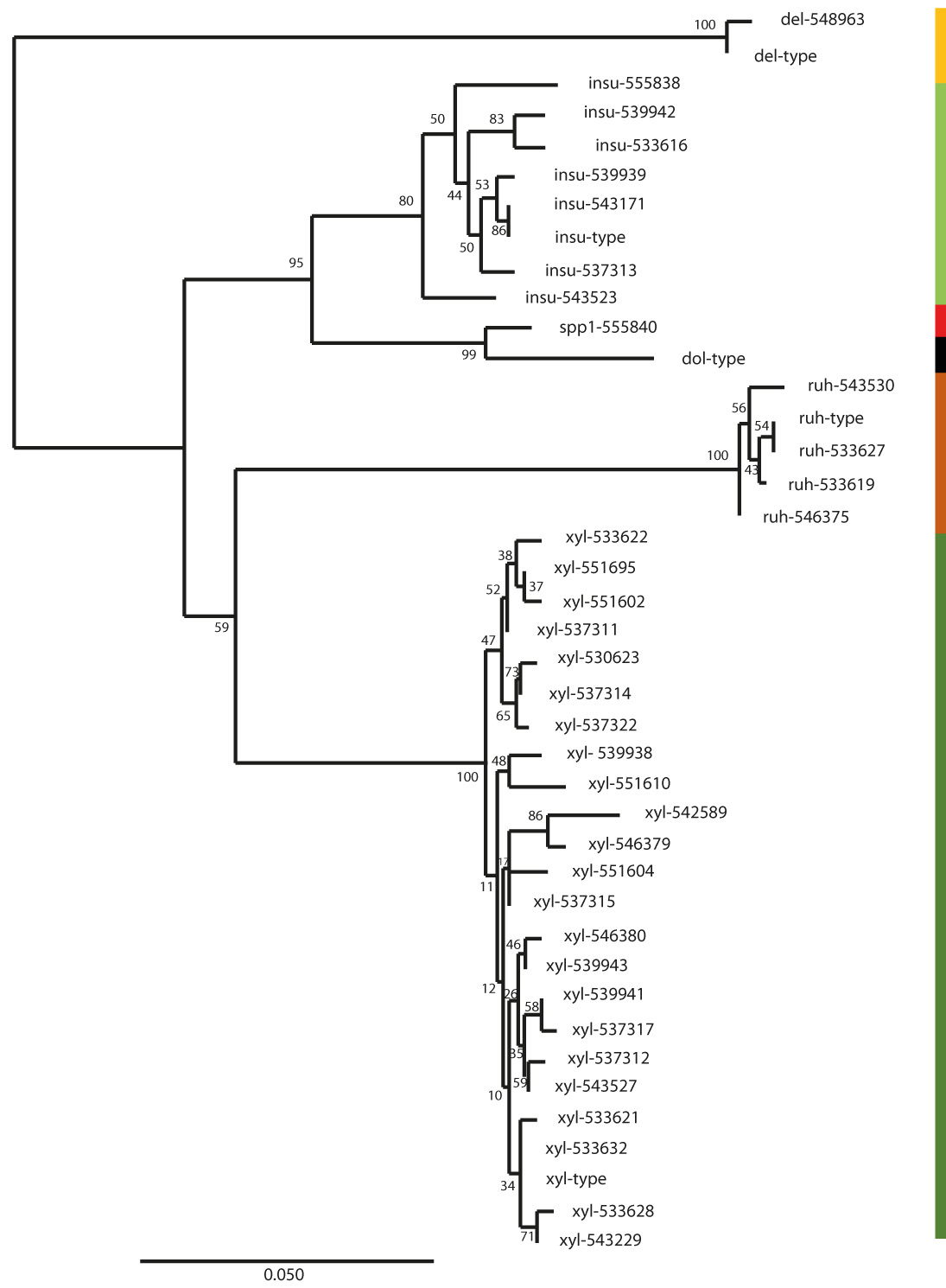 Prior to this study, 485 Achromobacter STs had been reported. MLST analysis of this collection yielded 53 novel alleles and 35 novel sequence types (STs), indicating that only a portion of the genetic diversity had been assessed previously. A total of 61 STs were present among the isolates in this study. Novel alleles and STs were submitted to the PubMLST database [https://pubmlst.org/general.shtml]. A MLST-based Minimum Spanning Tree showed that the isolates clustered by species. The isolates of the different species differed by at least 6 or 7 loci. The majority of the A. xylosoxidans isolates were not closely related as only six pairs of single-locus variants were present, whereas 18 the other sequence types diverged by 2 or more loci (Fig. 1).