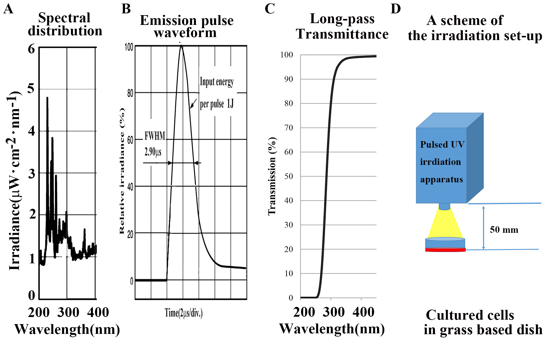 Spectra in the UV region (200–400 nm). (B) Emission pulse waveform. (C) Internal