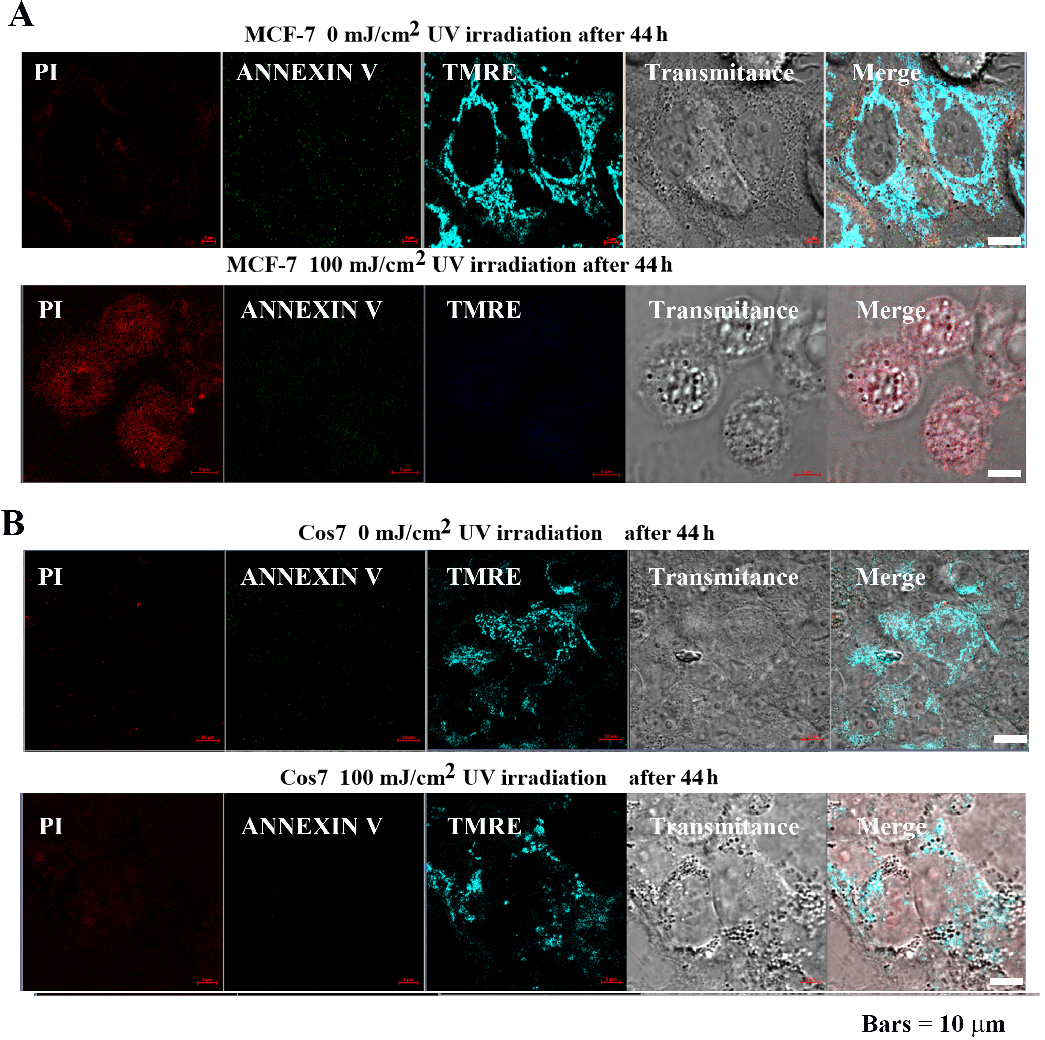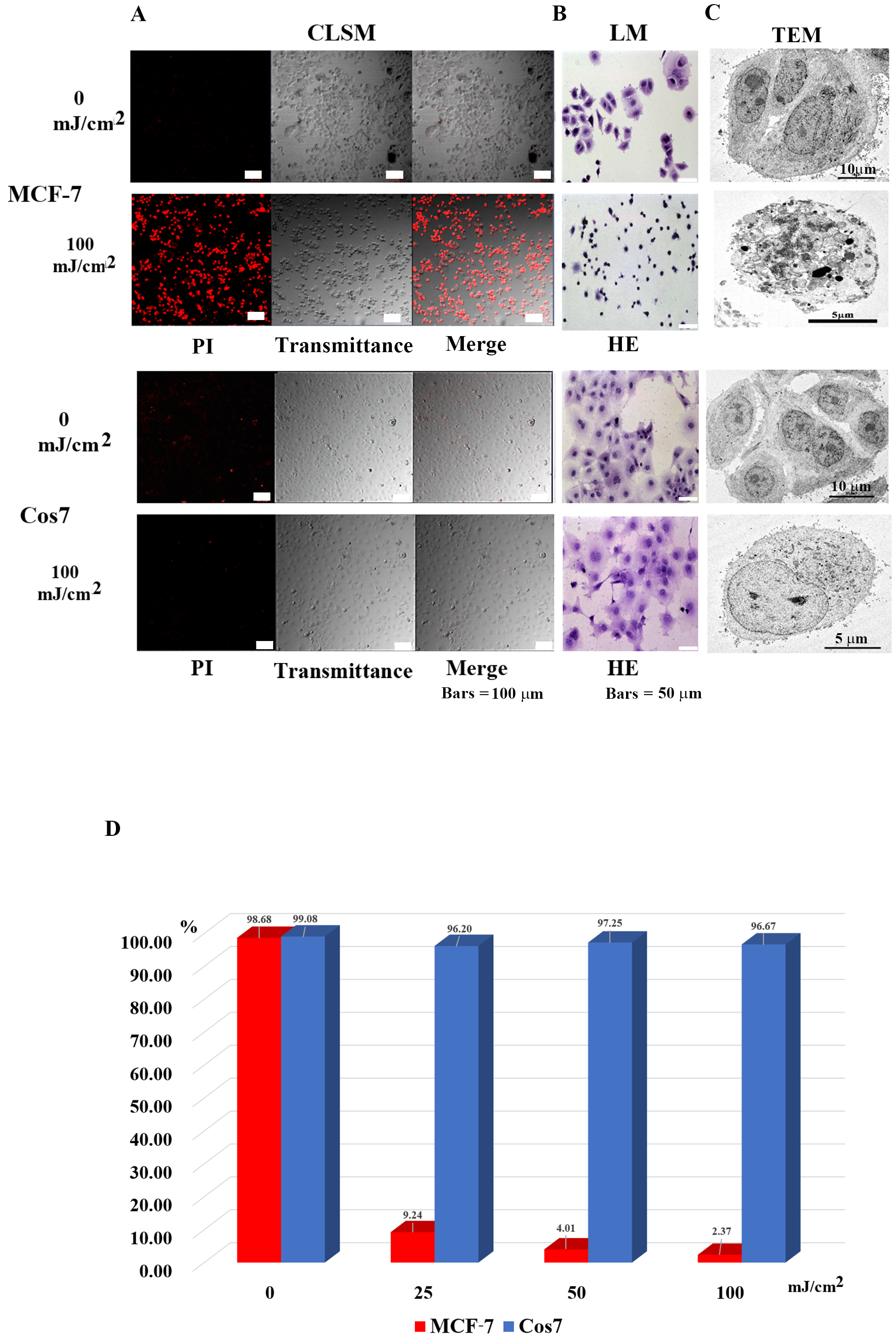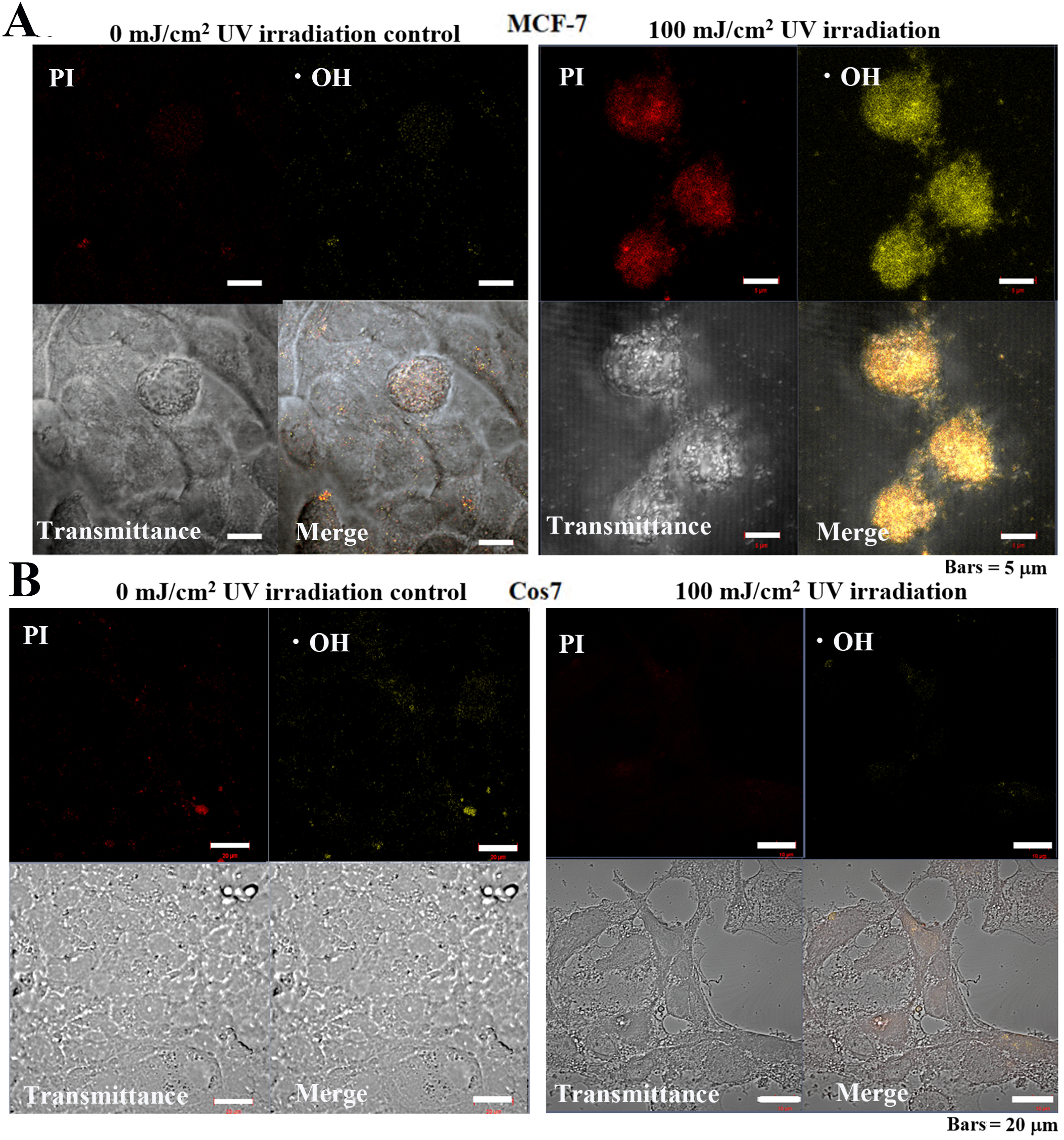 MCF-7 and Cos7 were irradiated with 0 and 100 mJ/cm