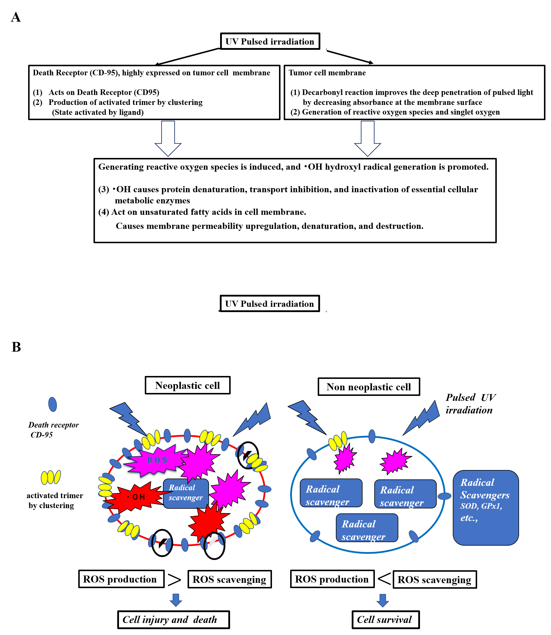Fig. 4.Hypothesis of a mechanism of selective tumor cell injury/killing in pulsed light irradiation. (A) Hypothesis: Cellular injury and death due to pulsed UV irradiation membrane disruption. (B) Hypothesis: Cellular injury and death due to scheduled UV membrane disruption in neoplastic cells vs. non-neoplastic cells. This hypothesis involves selective tumor cell death by pulsed UV irradiation. Functional differences exist between tumor and non-tumor cells. Death receptors, such as CD95, are highly expressed by tumor cells, while being lowly expressed by non-tumor cells. Additionally, radical scavenging is low in tumor cells and high in non-tumor cells. Pulsed UV irradiation directly activates death receptors, such as CD95, thereby inducing receptor trimerization and clustering, primarily in tumor cells. It then induces the production of ROS and further production of •OH radicals. As tumor cells have a lower radical scavenging function, the production of ROS and •OH radicals occurs in a chain reaction, causing membrane destruction of subcellular organelles. Conversely, non-tumor cells express fewer death receptors and have a higher radical scavenging function; therefore, the removal of ROS and •OH radicals is prioritized, and the cells typically survive.