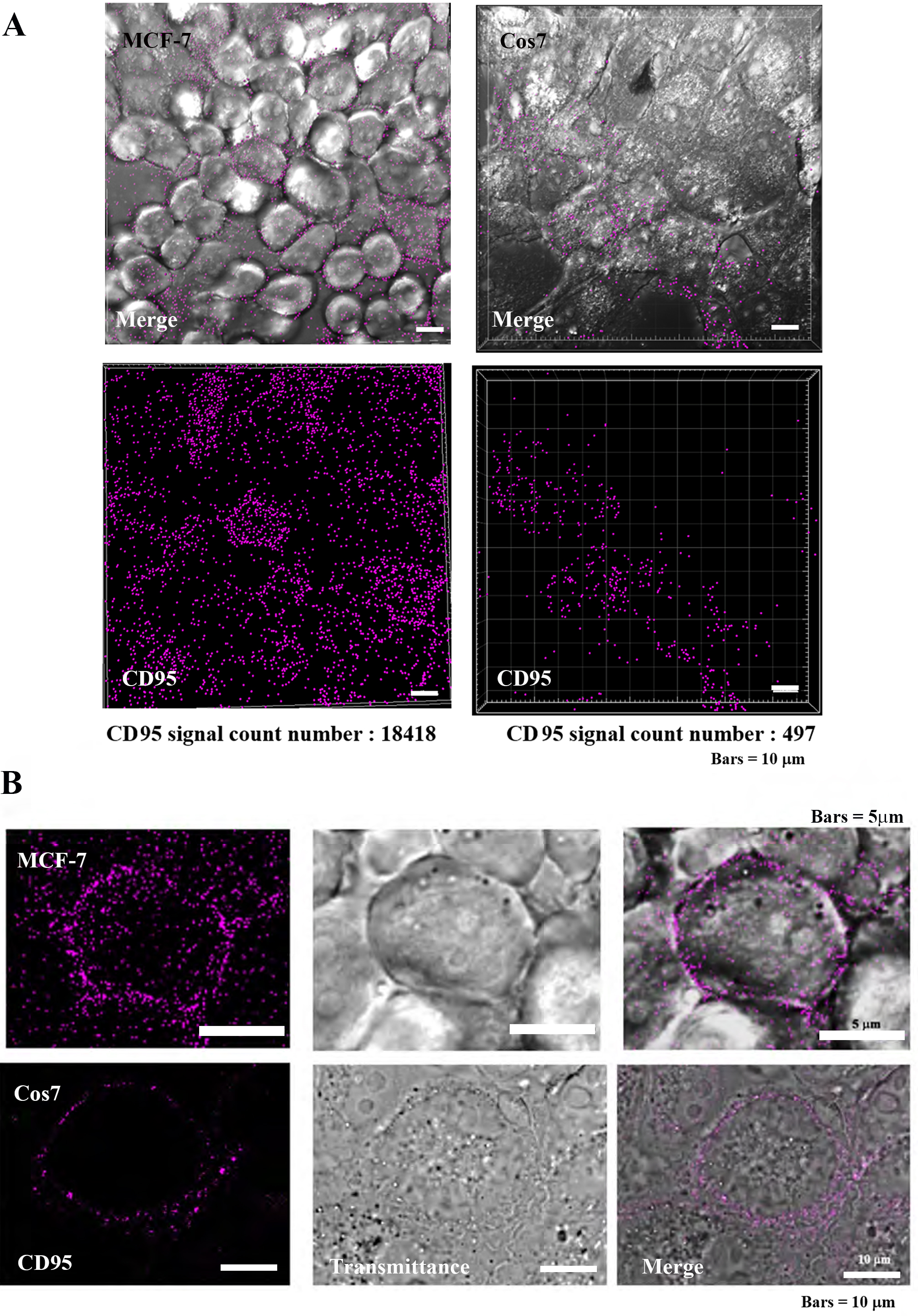 The death receptor (CD-95) is highly expressed on tumor cell membranes, and its localization was observed by immunocytochemical assay (Fig. 5) [15, 17, 18]. In tumor cells MCF7, CD95 was found to be highly localized on the plasma membrane, while in non-tumor Cos7 cells, CD95 was observed at low levels. The IMARIS analysis of positive counts in the same field of view showed MCF7:17418 and Cos7:497 positive grain, indicating that CD95 was approximately 37 times more localized in tumor cells (Fig. 5A). At the individual cell level, the localization of CD95 was clearly greater in tumor cells than in non-tumor cells (Fig. 5B).