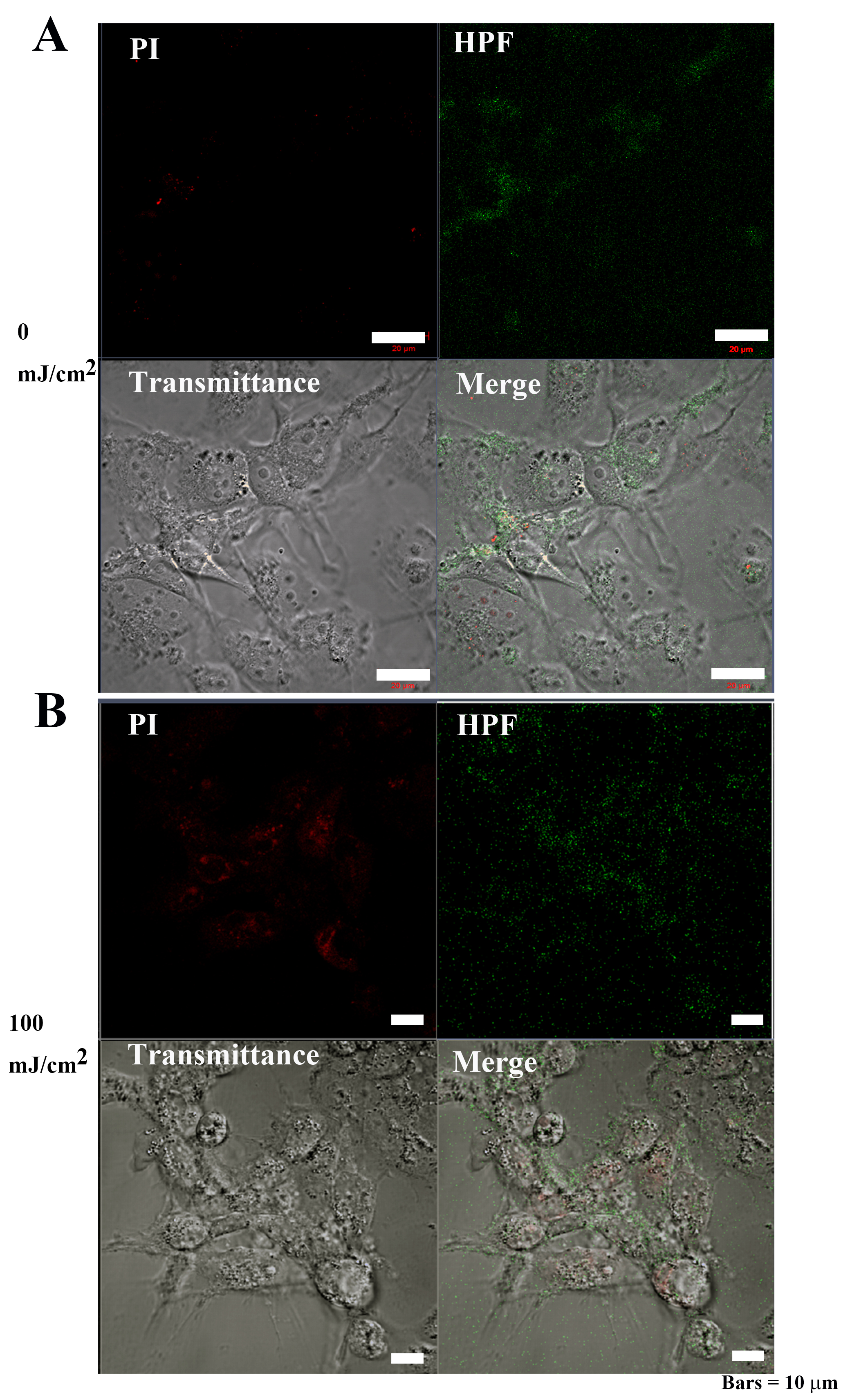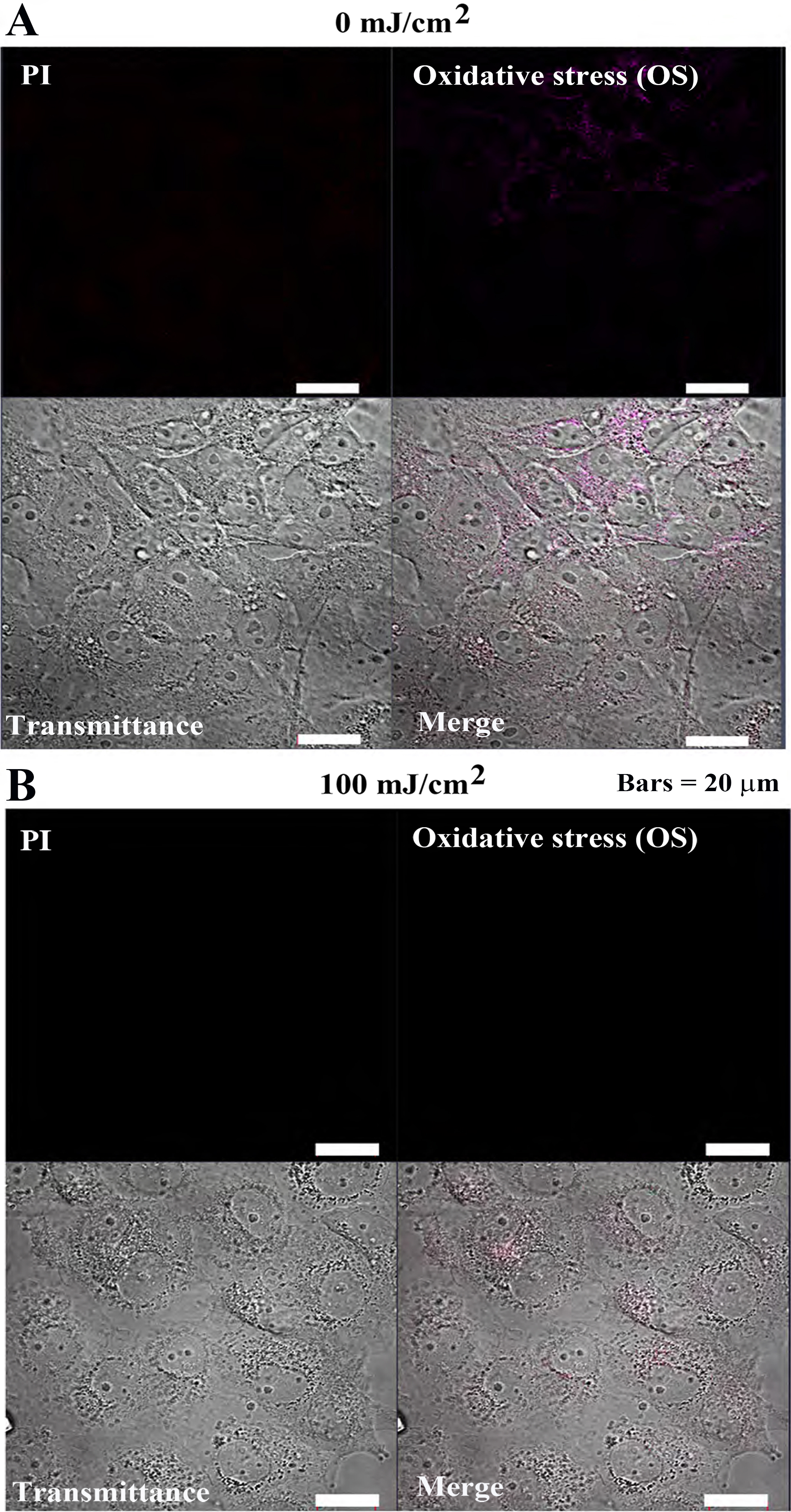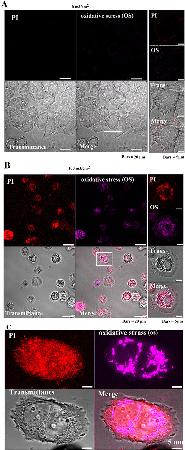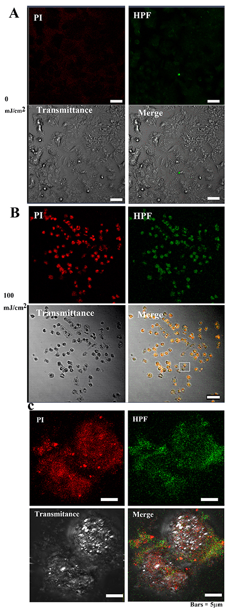 control cells exhibited weak PI and •OH, fluorescence signals (Fig. 10A), while cells treated with 100 mJ/cm