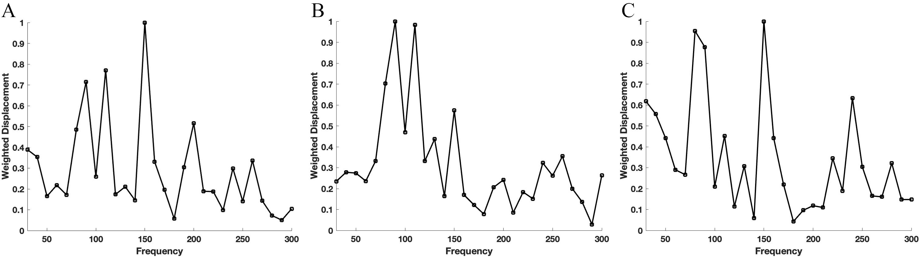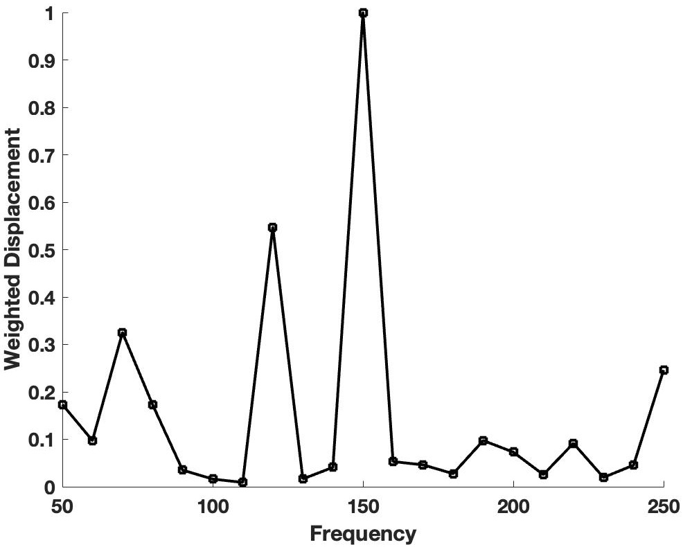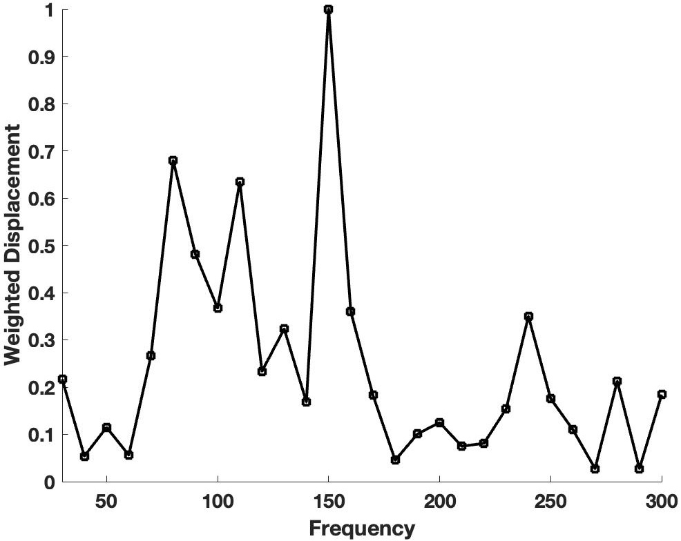 Fig. 1.Plot of weighted displacement versus frequency for human corneas. A normalized plot of weighted displacement versus frequency for a typical human normal control cornea collected in vivo is shown. The data was normalized by dividing the weighted displacements by the largest weighted displacement peak in the mechanovibrational spectrum. The raw data were previously reported [10] and recalculated in this study. Note the major resonant frequency peaks at 70, 120, 150, and 250 Hz.