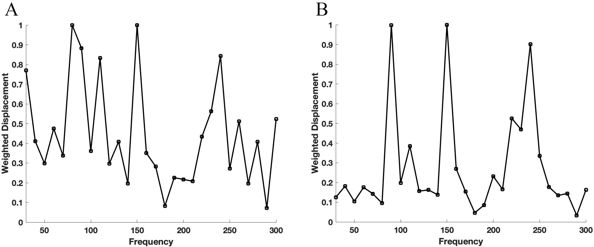 Fig. 4.Weighted displacement versus frequency for pig sclera. A typical plot of normalized weighted displacement versus frequency for a pig sclera measured in vitro in in the anterior (A) and posterior (B) segments of the eye is shown. Note the peaks shown at about 80 Hz (80–90 Hz), 110, 150 and 240 Hz (240–250 Hz).