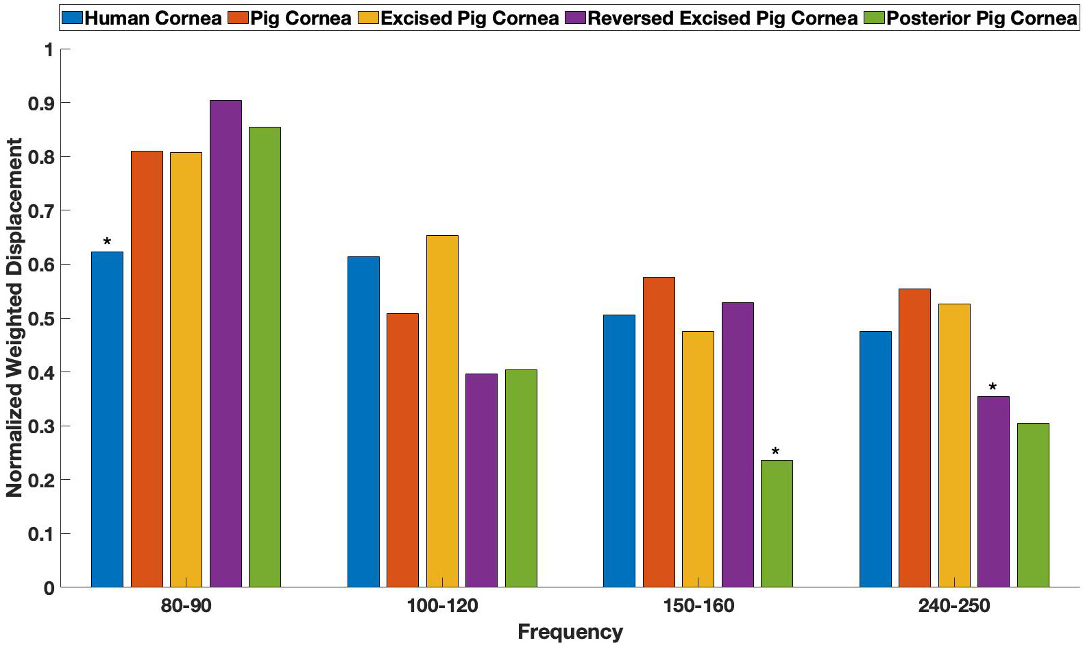 Fig. 7.Bar graph comparing normalized weighted displacement versus frequency for pig cornea. A comparison of pig cornea (excised cornea), reversed excised pig cornea (posterior side up) and excised posterior cornea (posterior cornea only) is shown. Note the changes in peak heights after the different corneal treatments. The resonant frequencies depicted at 80 Hz actual represent values determined from 80 to 95 Hz, while the ones depicted at 250 were collected from 240–250 Hz.