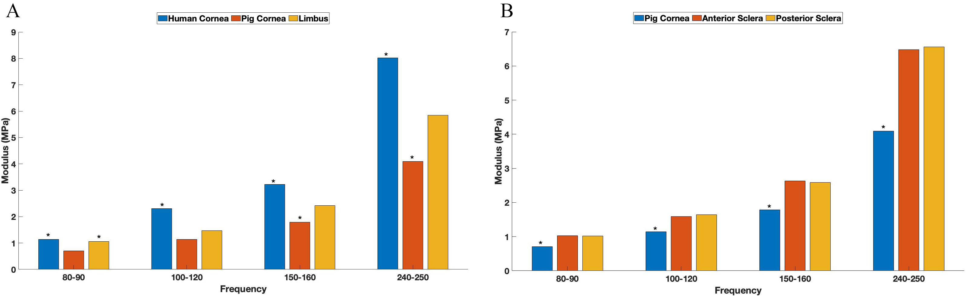 Fig. 5.Modulus values for human and pig corneas. The bar graph shows a comparison between the elastic modulus values for human and pig corneas and pig limbus (A) and cornea and sclera (B). Note the asterisks denote values that are significantly different at the 0.95 confidence level. Note the resonant frequencies depicted at 80 Hz actual represent values determined from 80 to 95 Hz, while the ones depicted at 250 were collected from 240–250 Hz.