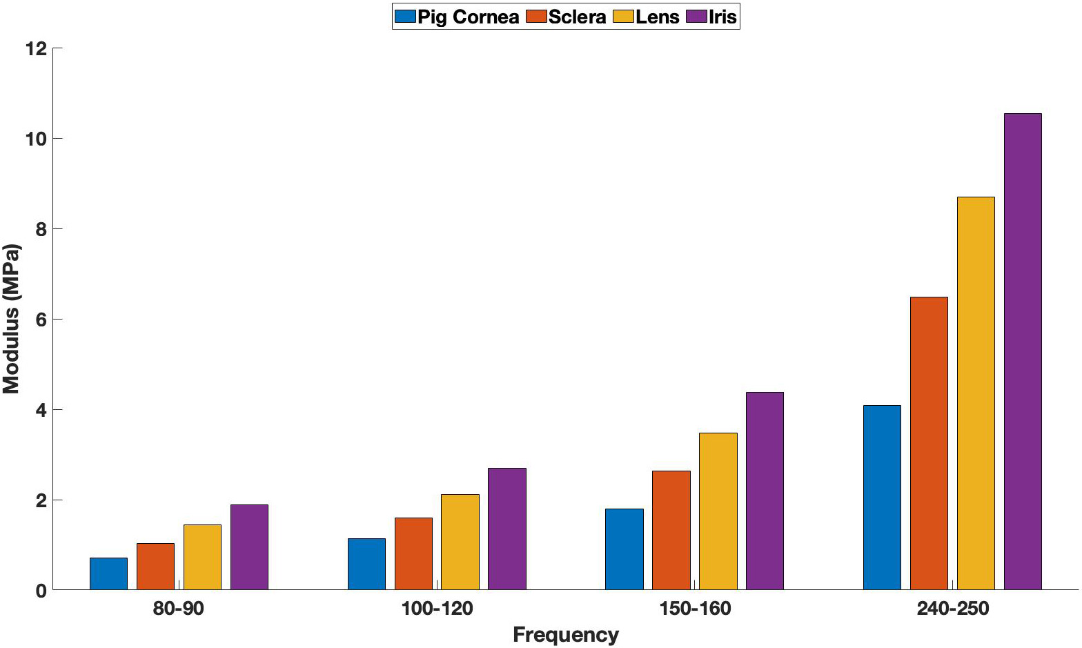 Fig. 6.Elastic moduli for pig cornea, sclera, iris and lens. The elastic moduli of iris and lens at 250 Hz is seen to be significantly higher than the modulus of cornea and sclera at a 0.95 confidence level. Note the resonant frequencies depicted at 80 Hz actual represent values determined from 80 to 95 Hz, while the ones depicted at 250 were collected from 240–250 Hz.