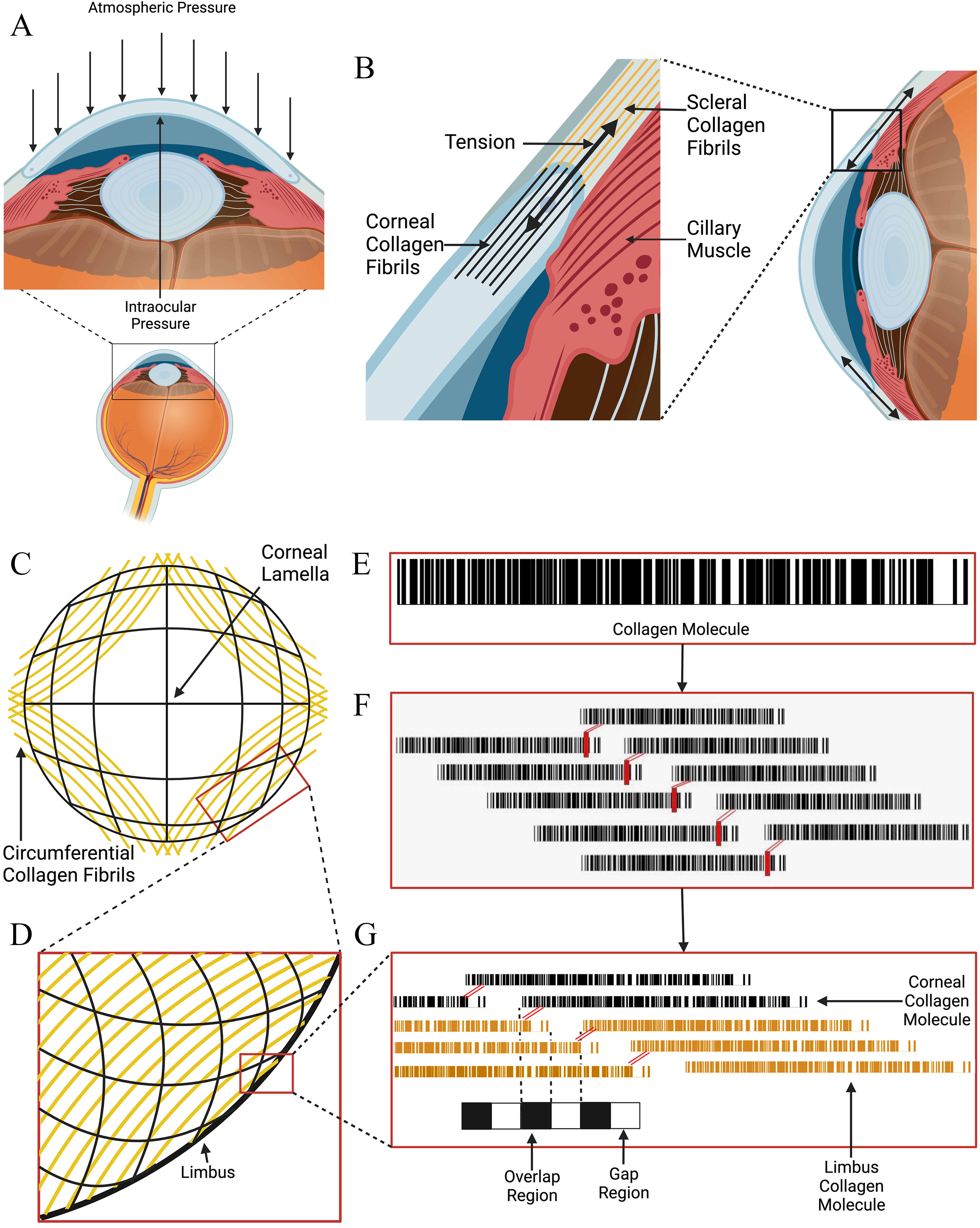 Fig. 8.Diagrammatic representation of the forces acting on the eye. This diagram illustrates the connections between collagen fibrils in the cornea and limbus that stabilize the corneal-limbus-scleral junction. The forces acting on the eye include the force of gravity, atmospheric pressure (A), tension in the sclera (B), lid pressure (not shown), the forces due to the orbital muscles (not shown), ciliary muscle (in the non-accommodation mode not shown), atmospheric pressure, and intraocular pressure. Hypothetical model of arrangement of collagen fibrils in the cornea (C), and limbus (D). The collagen molecule with its rigid and flexible regions is shown in E, the microfibril in (F) and crosslink connections between collagen fibrils of the limbus and cornea (G) that are part of the cornea-limbus-sclera mechanical unit that stabilizes the cornea from changes in size and shape during aging and mechanical loading. The collagen molecule in E is depicted as a series of light and dark bands that represent the flexible (light) and rigid (black) amino acid sequences in type I collagen that line up in register to form quarter-staggered microfibrils shown in F containing 5 molecules in cross-section and a longitudinal hole region. G shows an enlarged model showing that the connections between collagen fibrils in the limbus and cornea are stabilized by end-overlap crosslinks that form a continuous mechanical network.
