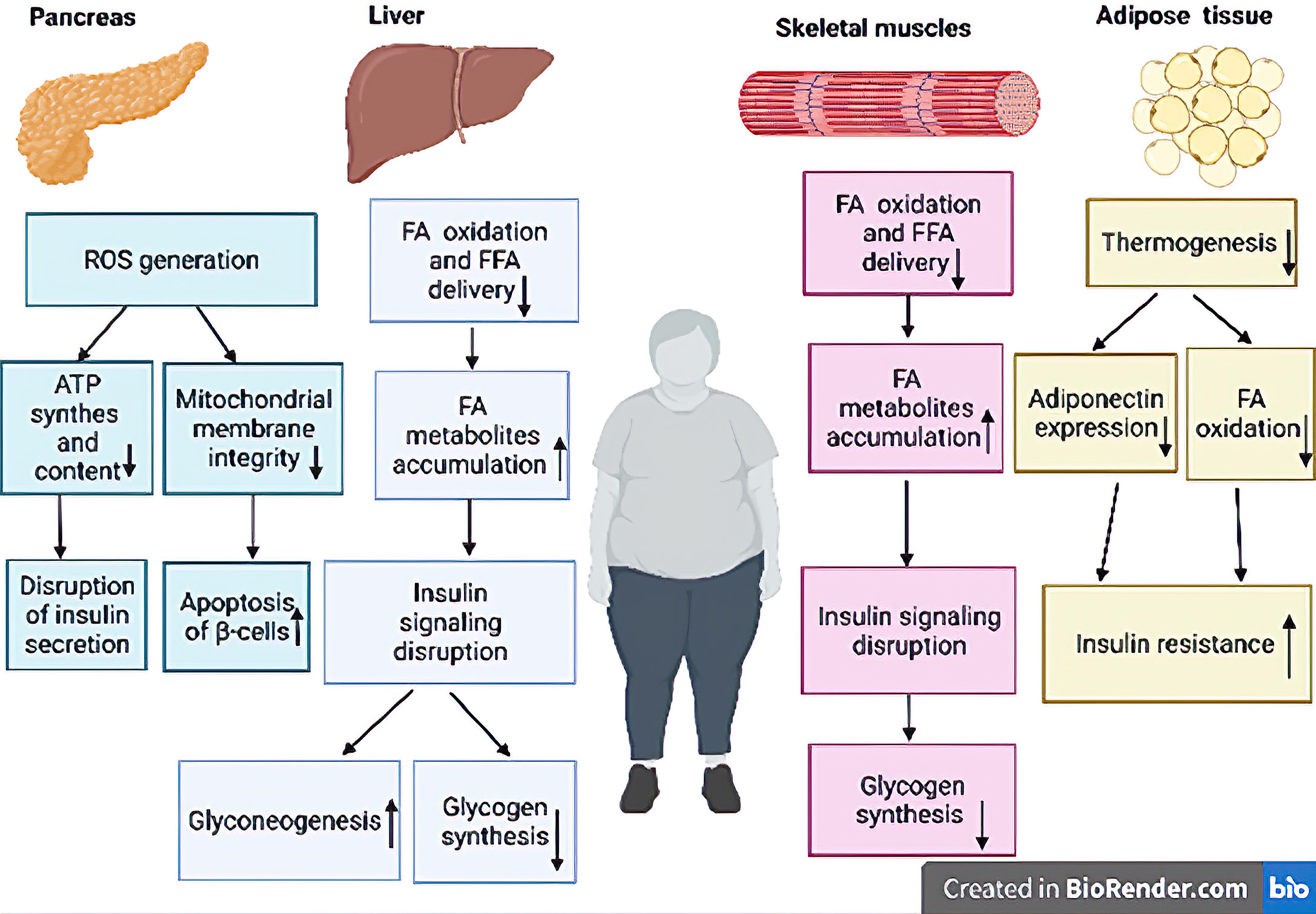 Insulin-resistant patients may have overt type 2 diabetes when pancreatic β-cells are unable to produce enough insulin to maintain normoglycemia. β-cells in the pancreas of T2DM patients cannot adequately perceive glucose, which contributes to impaired insulin secretion. The main factor leading to the development of mitochondrial dysfunction in pancreatic β-cells is oxidative stress [30].