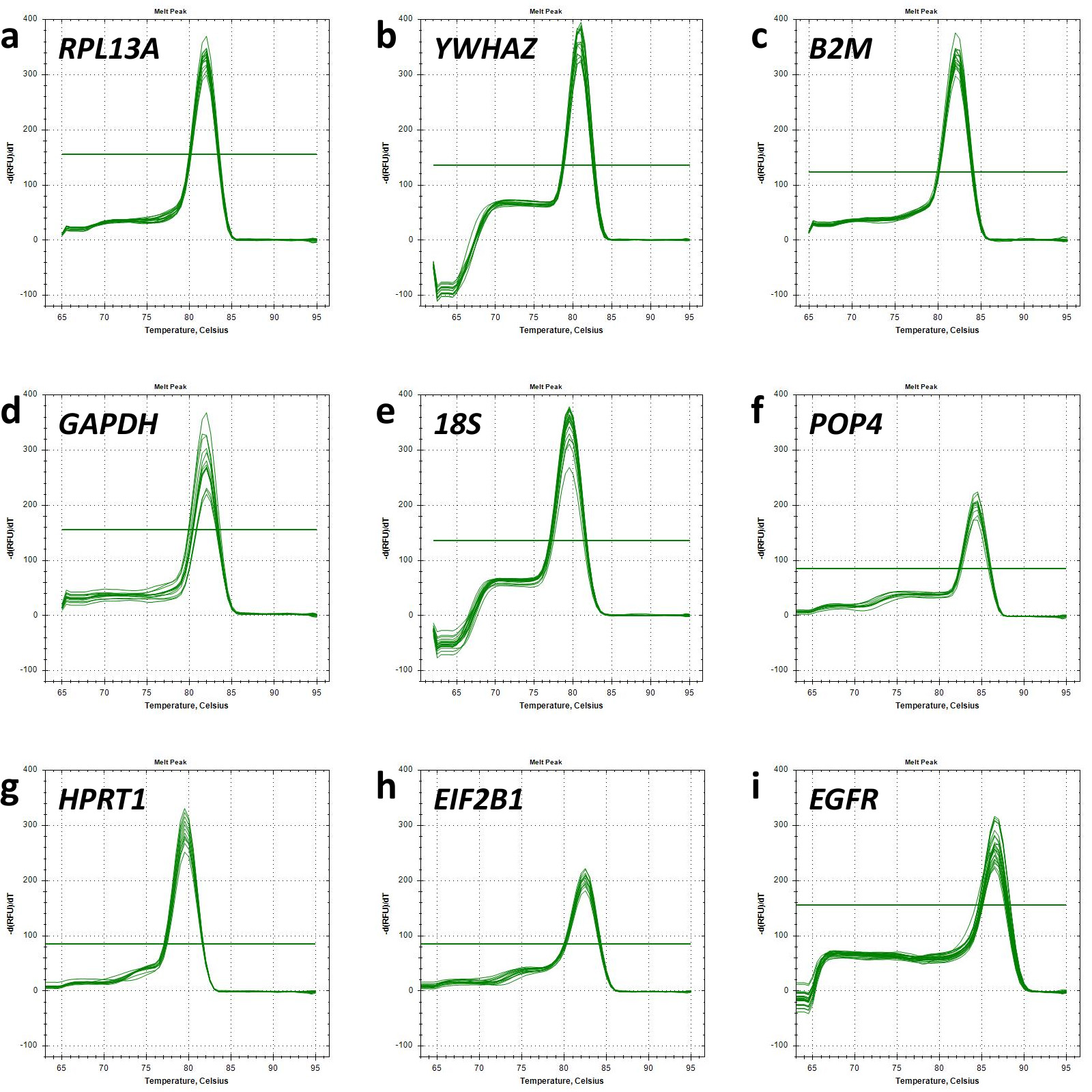 Melt curve analysis. Graphs of relative fluorescence intensity dependence as a function of temperature demonstrate the detection of single polymerase chain reaction (PCR) products for each target gene analysed. Horizontal lines represent threshold values of minor fluorescence intensity fluctuations. Melt curve for (a) RPL13A; (b) YWHAZ; (c) B2M; (d) GAPDH; (e) 18S; (f) POP4; (g) HPRT1; (h) EIF2B1; (i) EGFR.