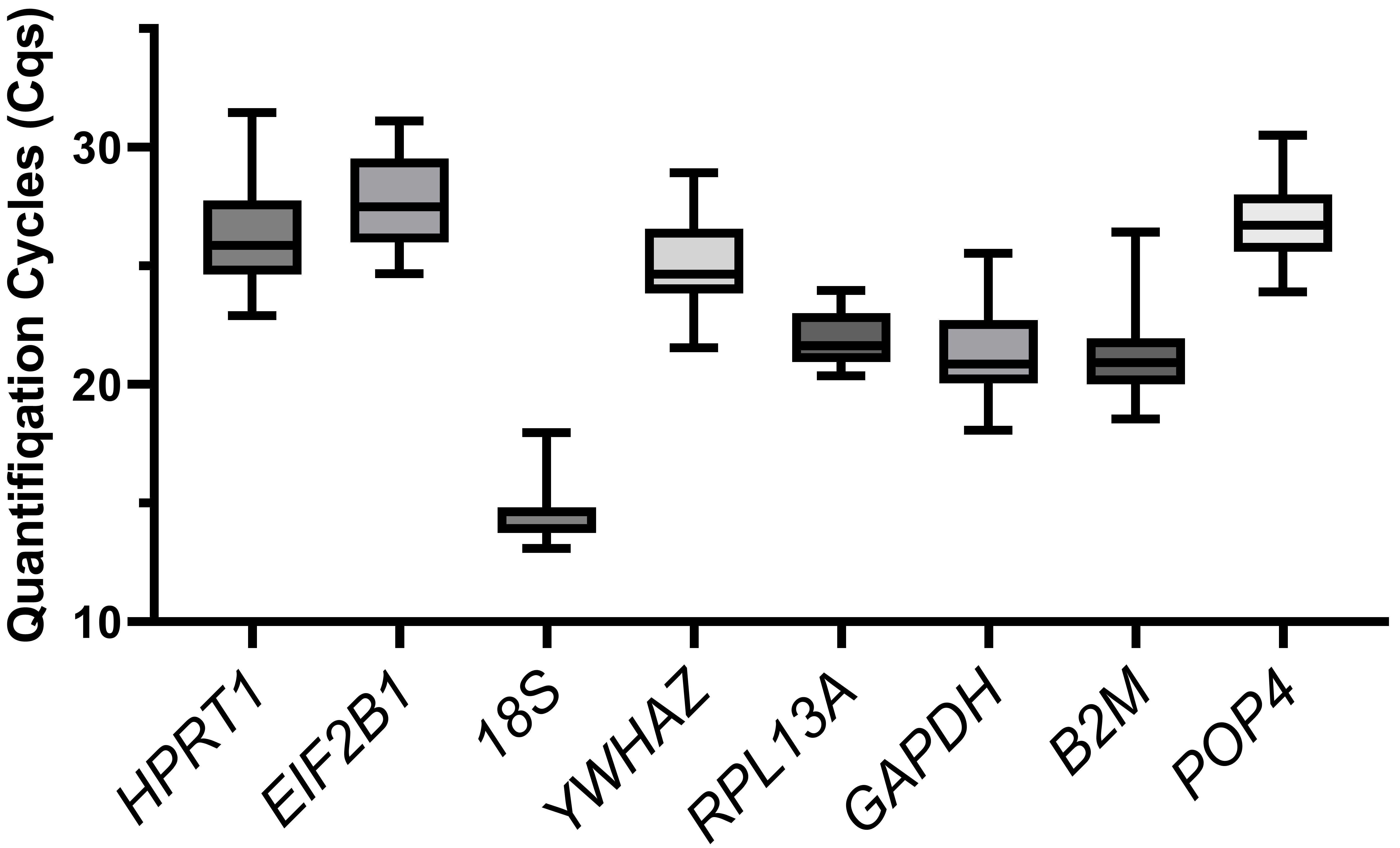 We compared the distribution of the Cq values of the reference genes for all the cells tested (Fig. 2). The 18S gene showed the highest expression (Cq = 13.1–18.0, median of 14.6), while EIF2B1 had the lowest expression (Cq = 24.7–31.1, median of 27.5). The Cq values (median meanings) of other housekeeping genes ranged from 21 to 26.
