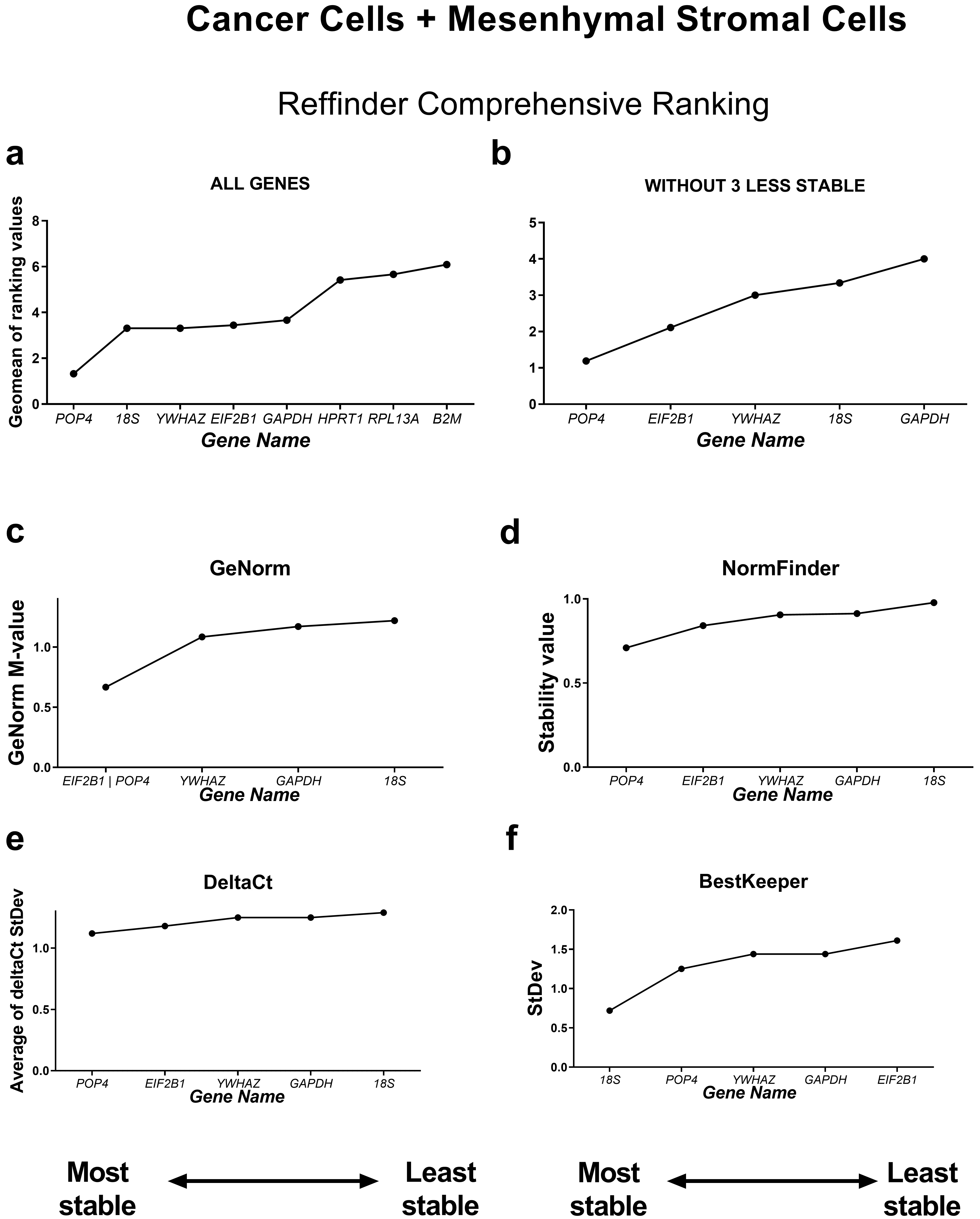 First, we compared the RefFinder comprehensive ranking results for these two subgroups (Figs. 4,5). In the cancer cell lines, POP4, GAPDH and EIF2B1 were the most stable genes, and B2M, RPL13A and HPRT1 were the least stable. This differed from the ranking of housekeeping genes in the subgroup of mesenchymal stromal cell cultures (MSCs), where none of the POP4, GAPDH or EIF2B1 genes were among the most stable ones. Moreover, GAPDH in MSCs had the highest ranking value. In MSCs, RefFinder indicated that 18S, B2M and RPL13A were the most stable genes (Fig. 5), while GAPDH, HPRT1 and YWHAZ were identified as the most variable genes.