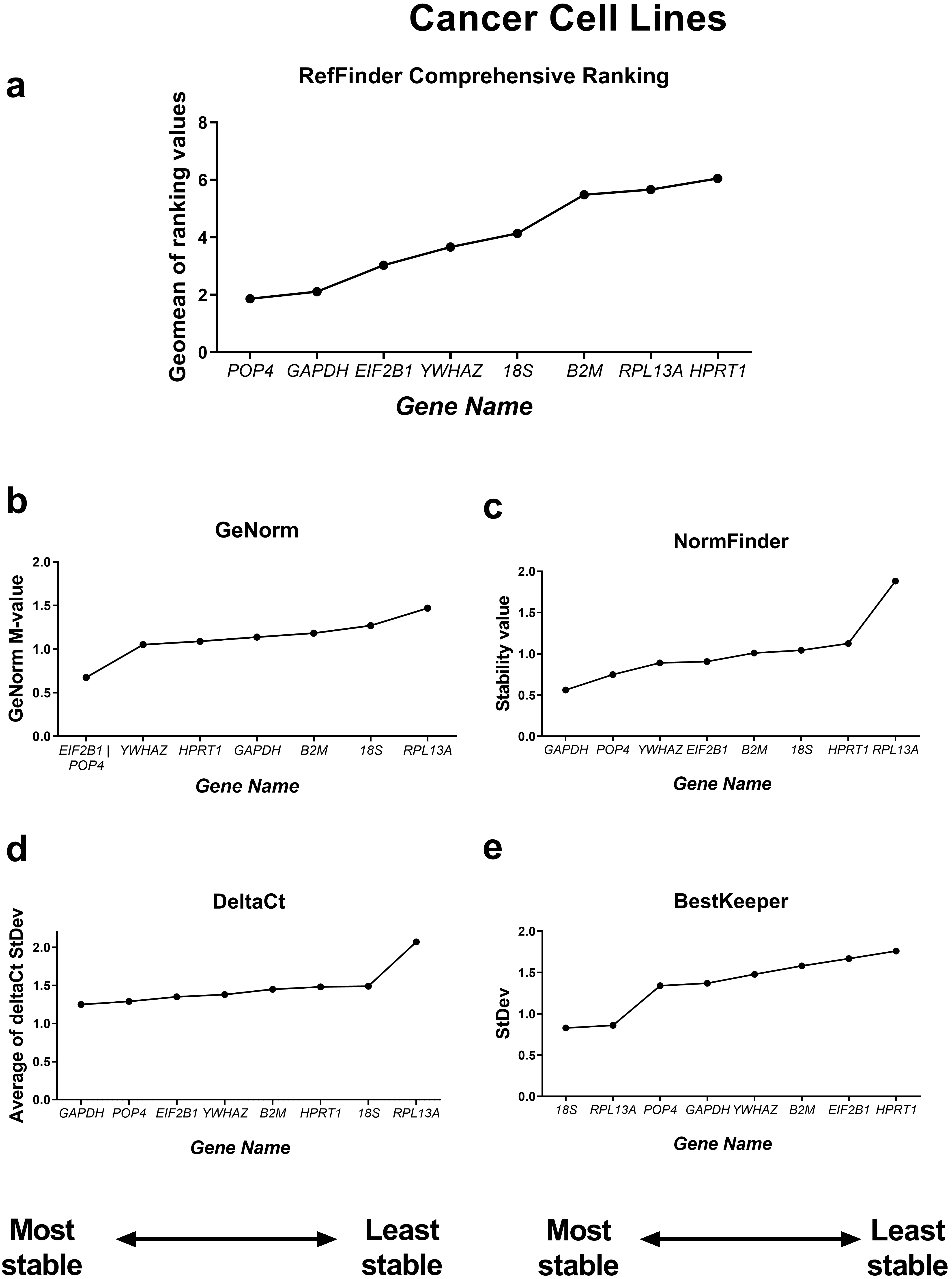 Our results provide technical information about the reference gene expression stability, and we don’t aim to distinguish the mechanisms affecting variability in gene expression in the experiments. The observed changes between the cell line panels could have originated from the changes in transcriptional and posttranscriptional regulation at the subcellular level, as well as from the differences in cell subtype composition within the samples. However, in this section we attempt to compare our data with those from previous research to discuss possible factors affecting observed differences in the reference gene expression stability.