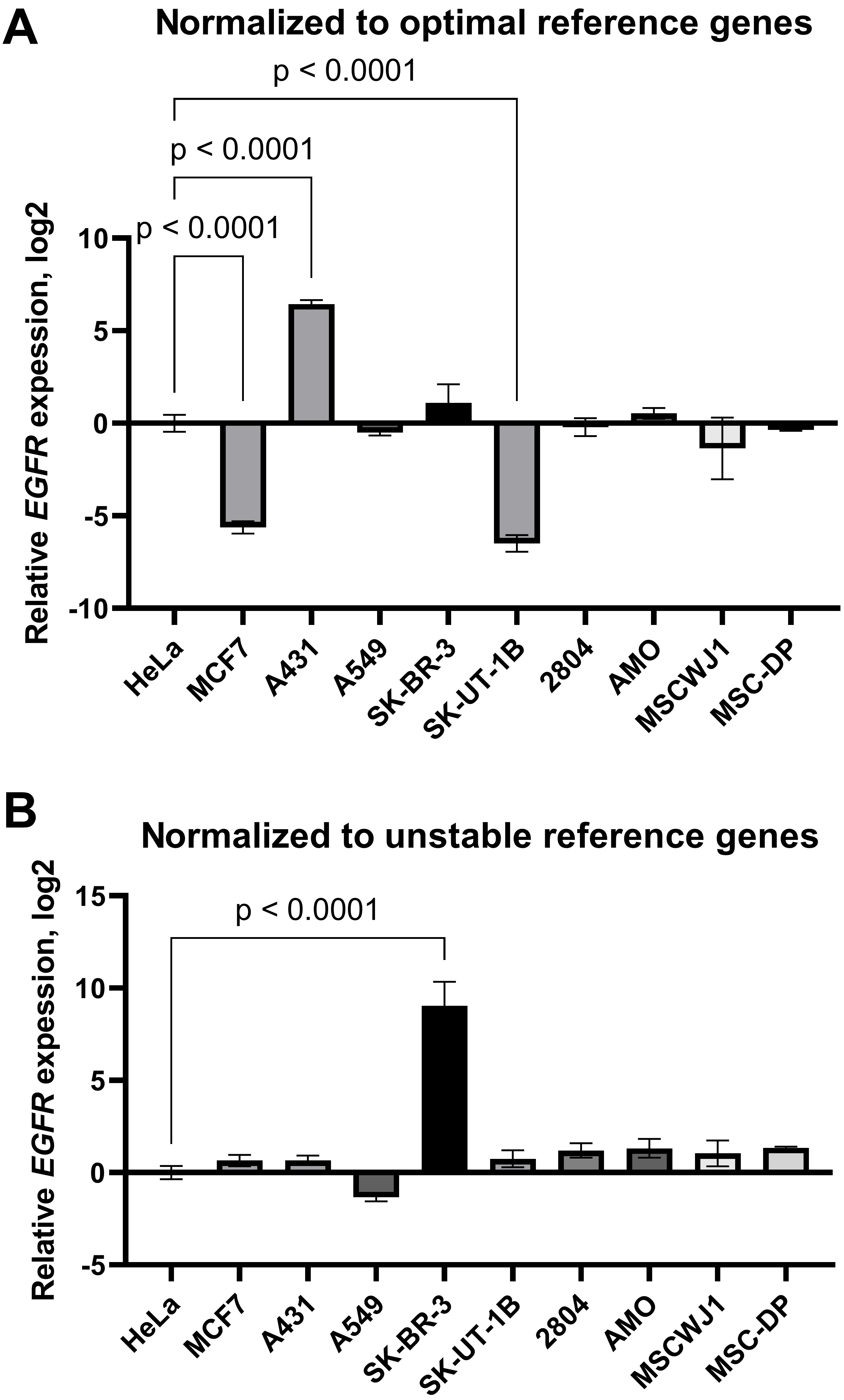 Finally, to demonstrate that the results concerning the target gene expression can differ depending on the reference genes chosen, we conducted an analysis of the expression of epidermal growth factor receptor (EGFR), a transmembrane protein involved in the regulation of cell survival, growth, proliferation and differentiation. As the dysregulation of EGFR expression and signalling is closely linked to cancer progression [25], investigations of EGFR-mediated signal transduction and intracellular transport peculiarities in cancer versus normal (non-malignant) cells are of considerable interest to many researchers.