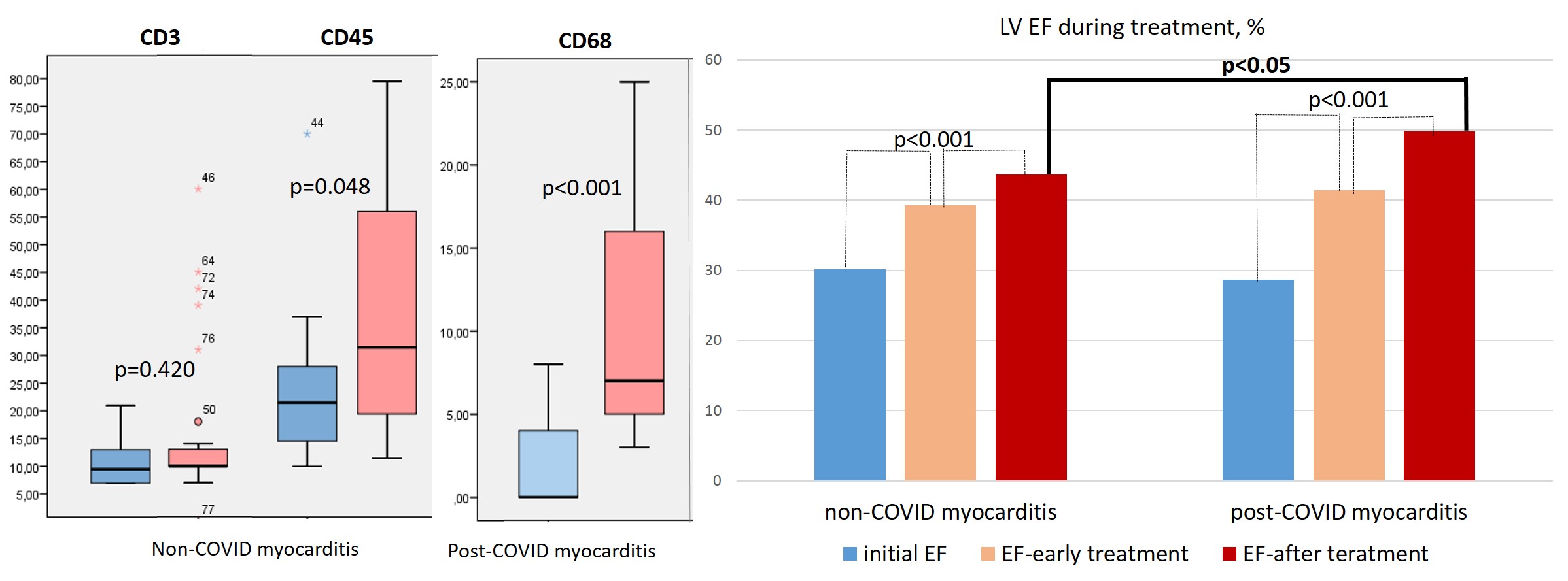 Response to therapy and dynamics of LV EF in patients with non-COVID and post-COVID myocarditis. LV EF, left ventricular ejection fraction; COVID, coronavirus disease.