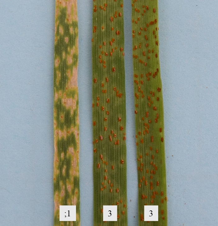 The seedling tests in the F1 generation showed susceptibility in all plants, indicating that the resistance is conferred by a recessive gene(s). The results of the χ2 test revealed that the observed segregation ratios of the F3 families followed the expected values, suggesting that a recessive gene confers the leaf rust resistance present in T. spelta 109. According to our results and the reported recessive genes identified among the T. spelta accessions, the identified recessive gene in T. spelta 109 (PI355580) is different and most likely a novel leaf rust resistance gene.