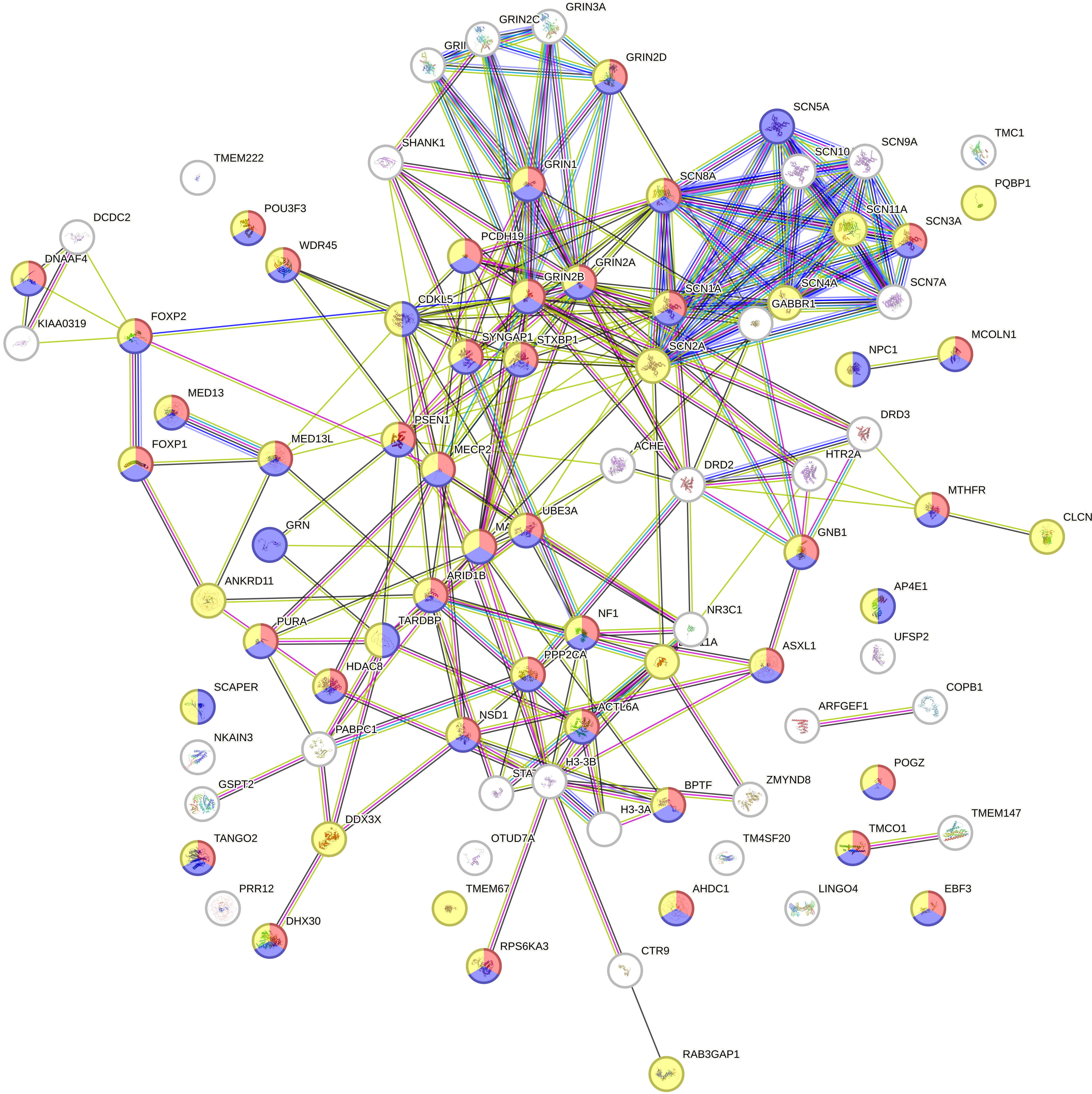 The resulting STRING-derived PPI network (Fig. 3) revealed several dense, distinct clusters of interacting proteins, each cluster corresponding to specific biological processes. Most of the clusters are related to language and neurodevelopment. To enhance interpretability, we applied a phenotype-based color-coding scheme to the network nodes using classifications from the Monarch Initiative (a database integrating genotype–phenotype relationships). This scheme highlights key categories of developmental language disorder phenotypes within the network, with each phenotype category assigned a unique node color in (Fig. 3).