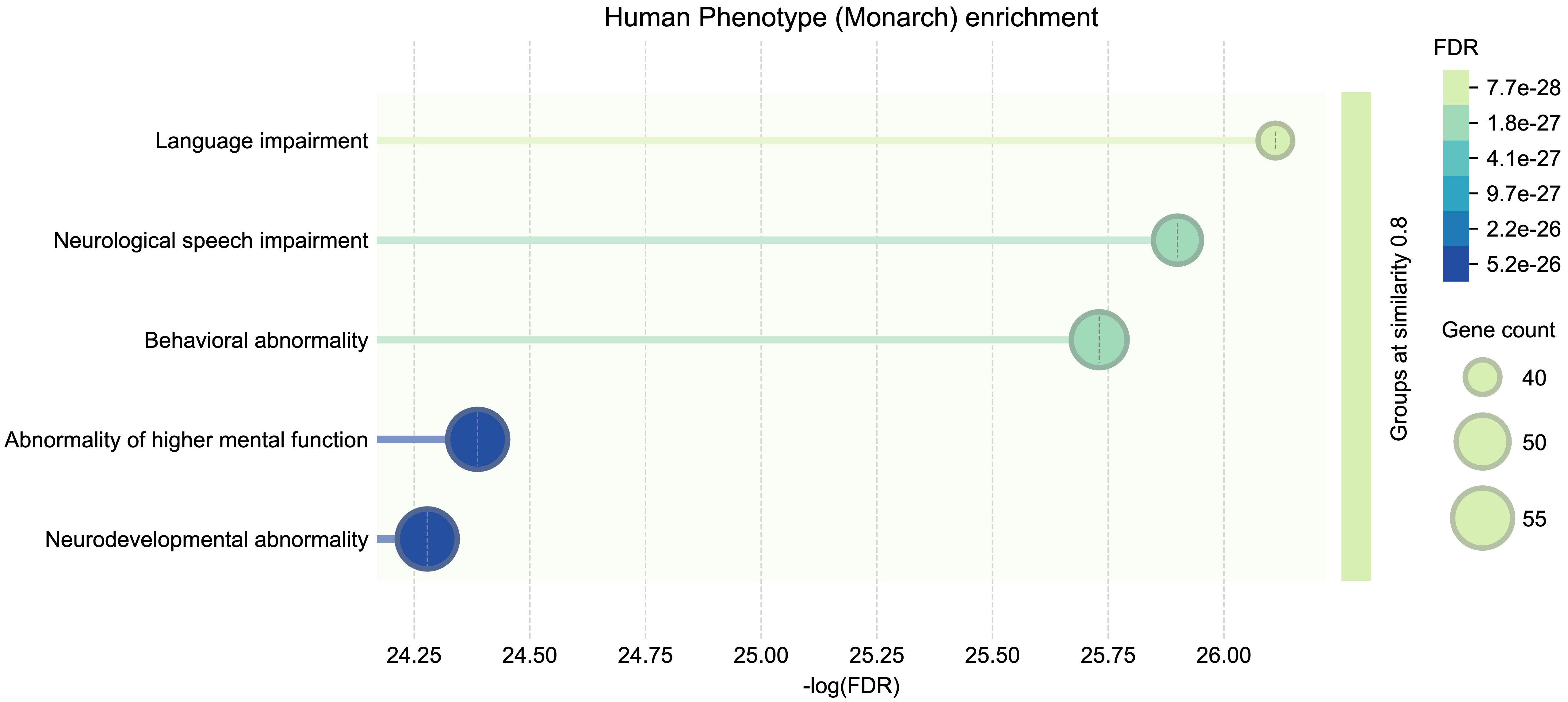 In addition to this qualitative visualization, we conducted a functional enrichment analysis of the network gene set against phenotype annotations from the Monarch Initiative. The major phenotype classes represented among the biomarker proteins directly relevant to developmental language disorders (DLDs) include Language impairment (in red), Neurological speech impairment (in blue), and Neurodevelopmental abnormality (in yellow). All of these enriched phenotype associations remained significant after correction for multiple testing (with FDR values on the order of 10-26 to 10-28), underscoring the robustness of the enrichment. The full spectrum of significant phenotype terms is summarized in Fig. 4.